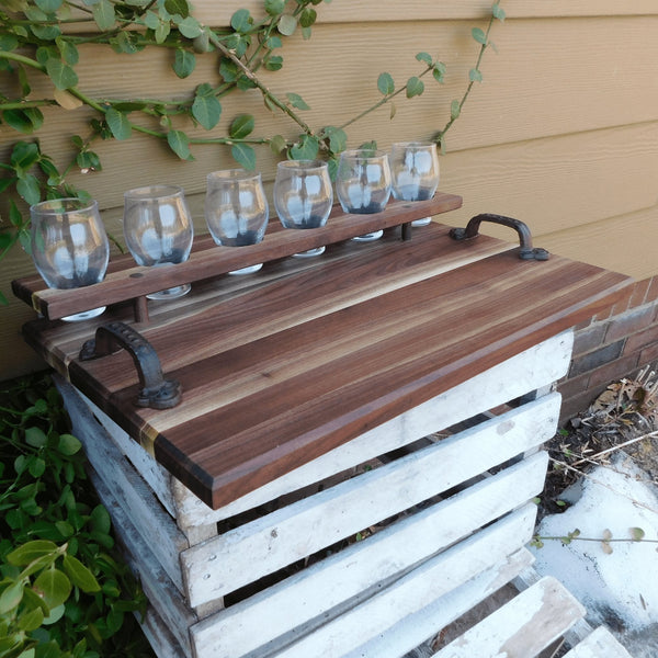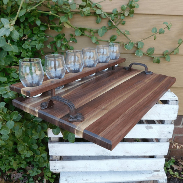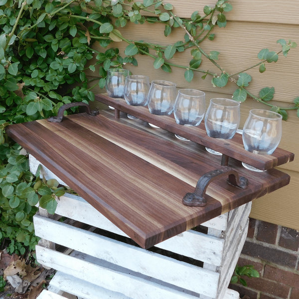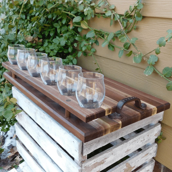 Black Walnut Beer Flight Charcuterie Board with Luminarc Barlow 5.5 oz. Taster Glasses, Cast Iron Handles, & Clear Rubber Grip Feet