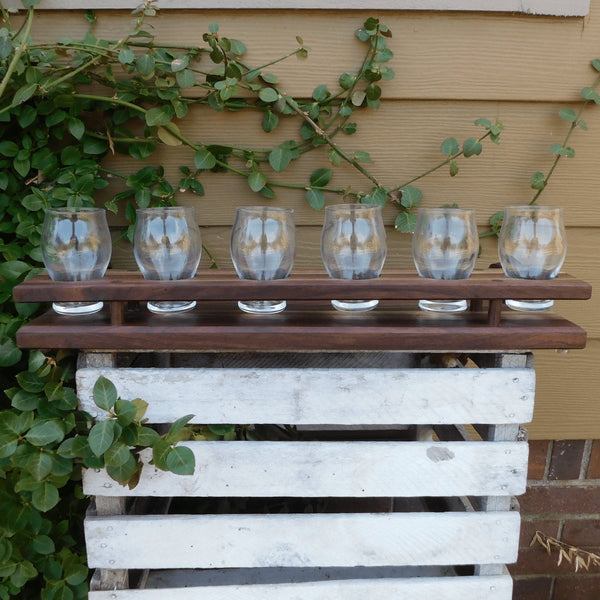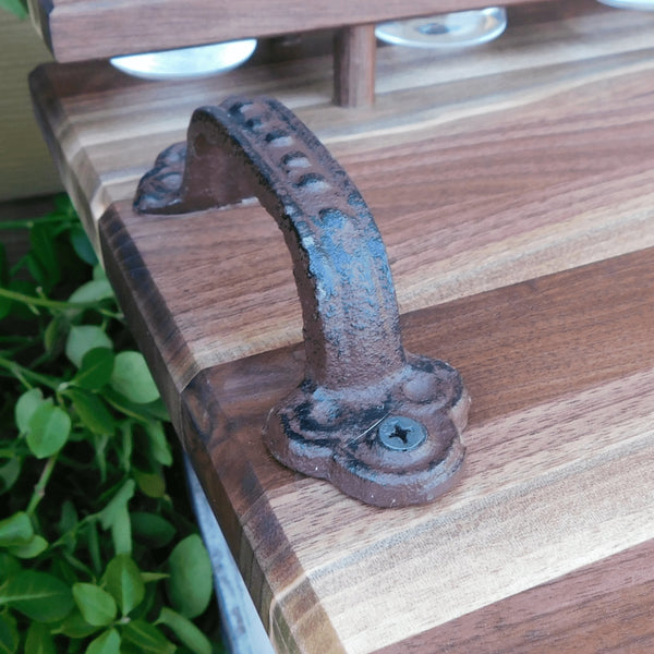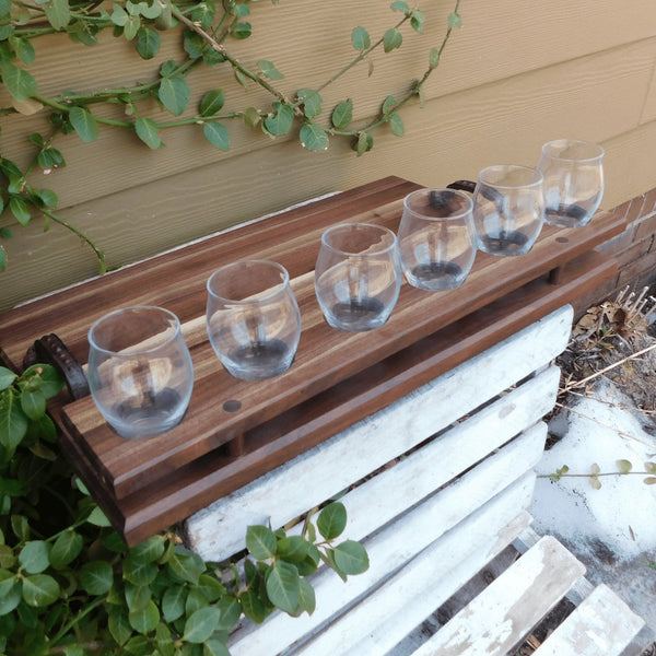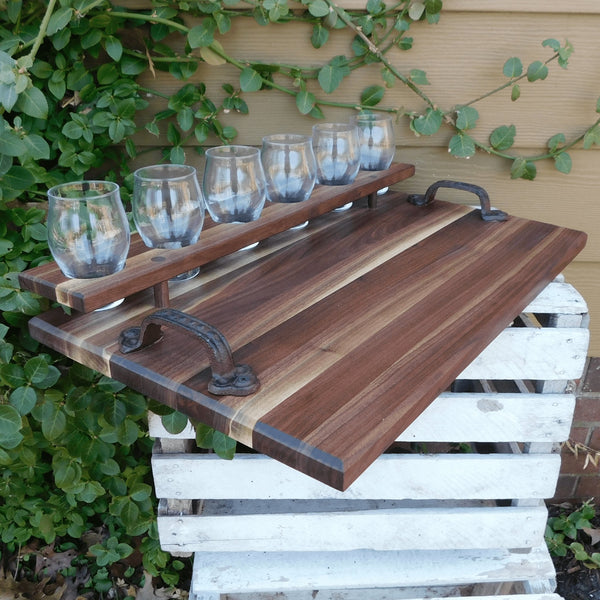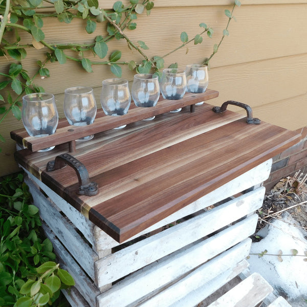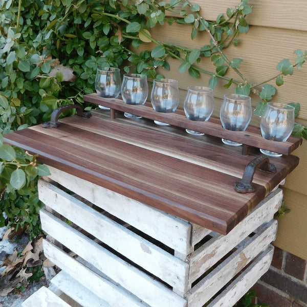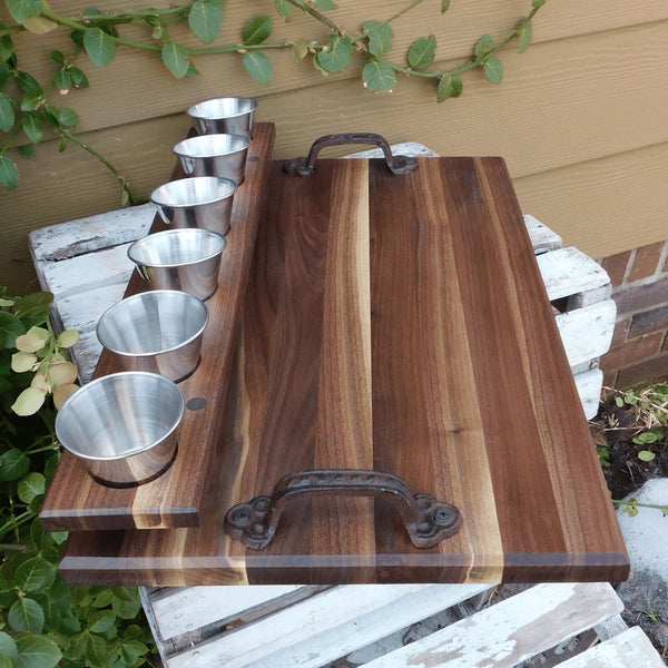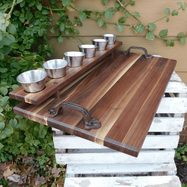 A stunning Black Walnut beer flight charcuterie board with cast iron handles and clear rubber grip feet. This unique beer flight board includes 6 Luminarc Barlow 5.5 oz. taster glasses, and 6 - 4 oz. commercial grade stainless steel dipping sauce cups that fit this board perfectly! This board is finished in a food grade bees wax and oil mixture to give it a beautiful sheen!