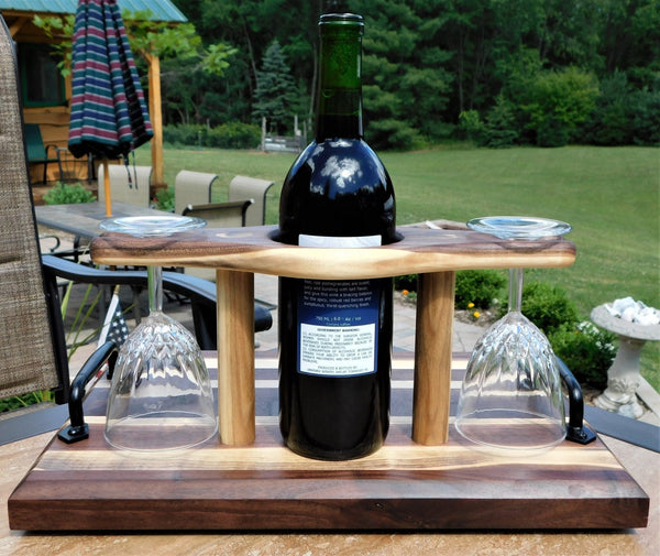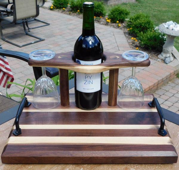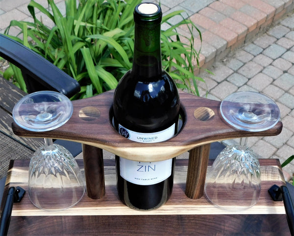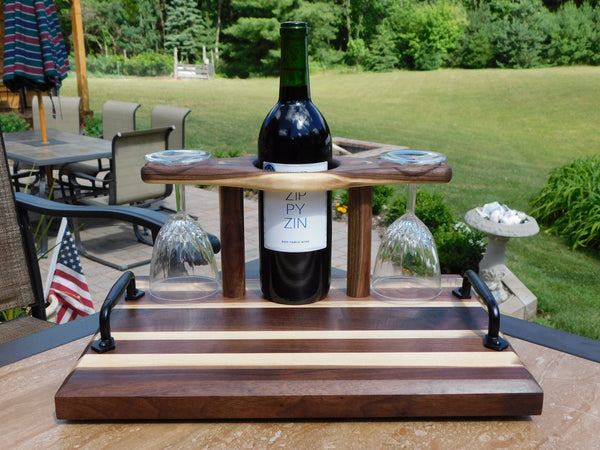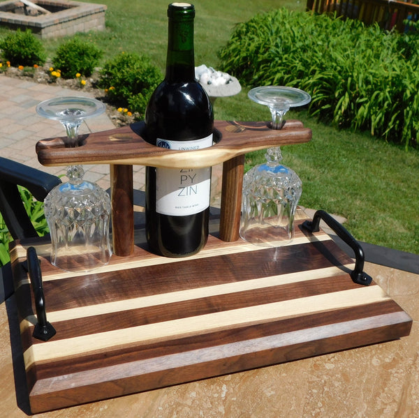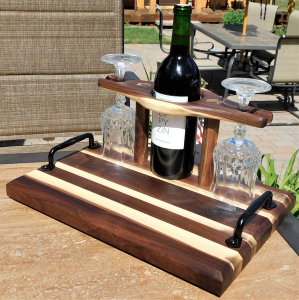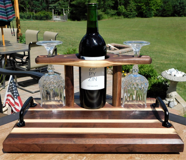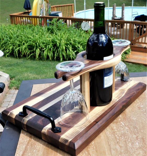Black Walnut Butcher Block Style Wine Caddy Cutting Board with Wine Glasses