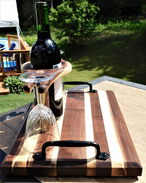 A beautiful Black Walnut butcher board style wine caddy cutting board, with cast iron handles and clear rubber grip feet. This unique wine glass board includes 2 wine glasses and is finished in a food grade bees wax and oil mixture to give it a beautiful sheen!