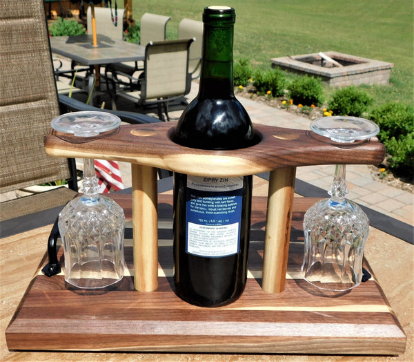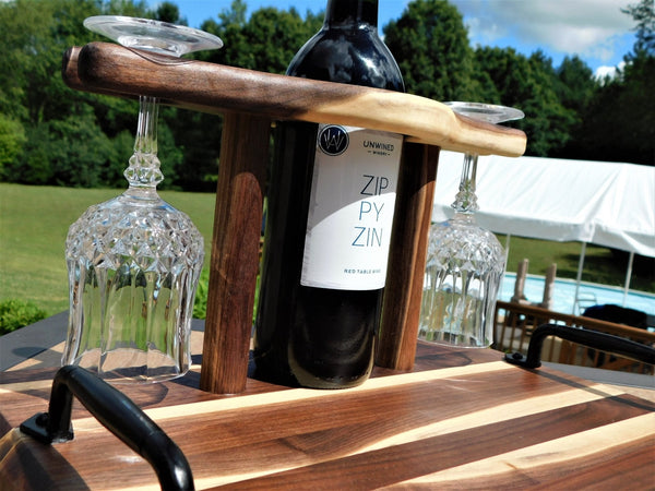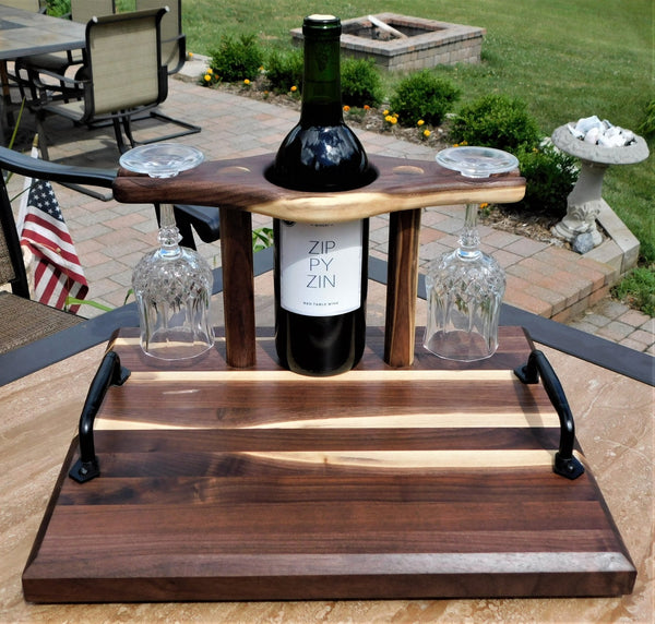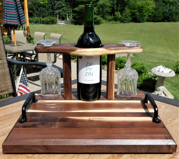 Black Walnut Butcher Block Style Wine Caddy Cutting Board with Wine Glasses