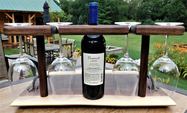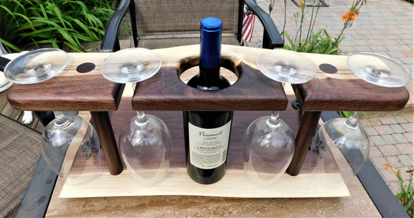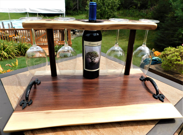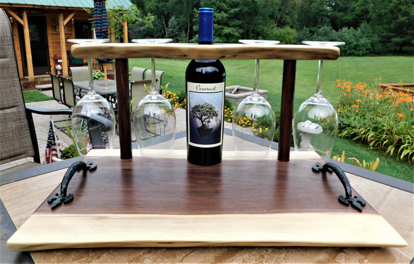 A luxurious Black Walnut hardwood wine glass charcuterie board with cast iron handles and clear rubber grip feet. This unique wine glass board includes 4 Schott Zwiesel wine glasses and is finished in a food grade bees wax and oil mixture to give it a beautiful sheen!