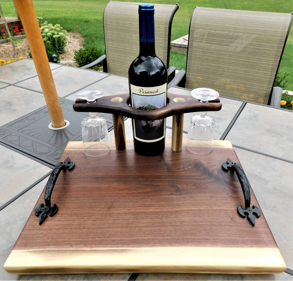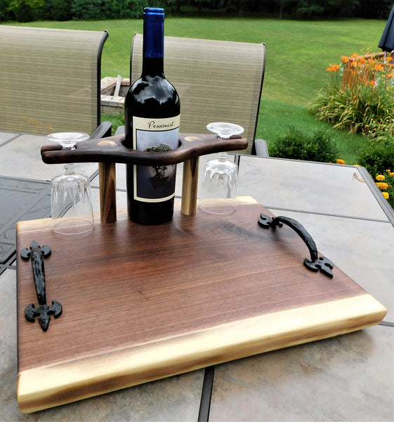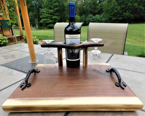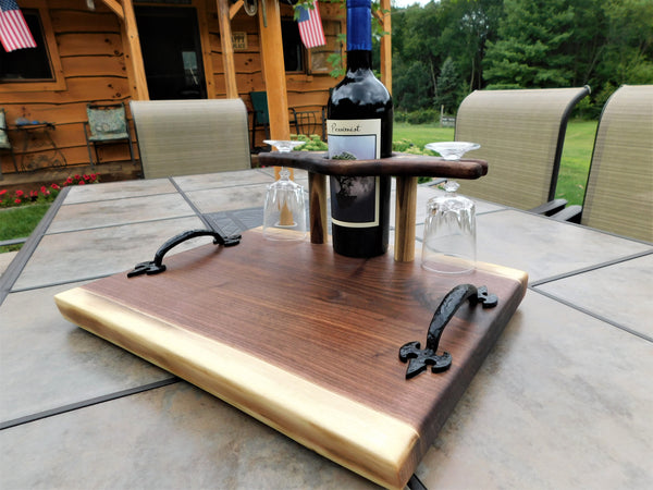 A luxurious Black Walnut hardwood wine glass charcuterie board with cast iron handles and clear rubber grip feet. This unique wine glass board includes 2 wine glasses and is finished in a food grade bees wax and oil mixture to give it a beautiful sheen!