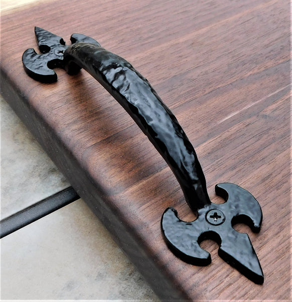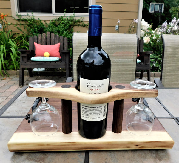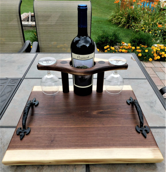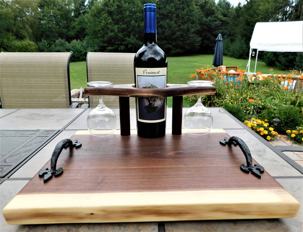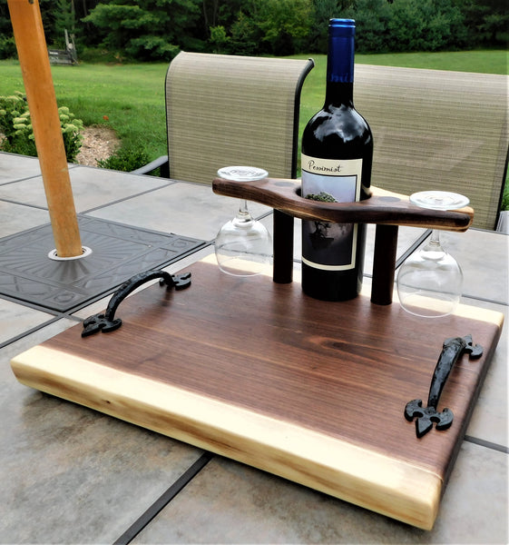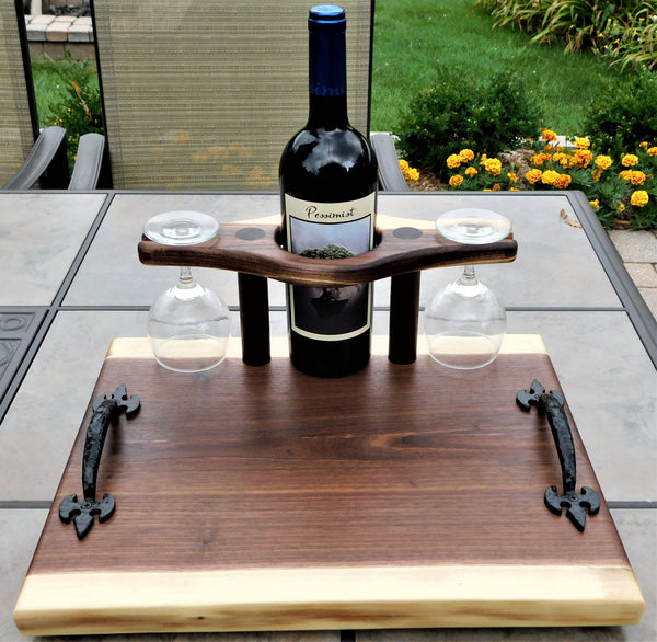 A luxurious Black Walnut hardwood wine glass charcuterie board with cast iron handles and clear rubber grip feet. This unique wine glass board includes 2 wine glasses and is finished in a food grade bees wax and oil mixture to give it a beautiful sheen!