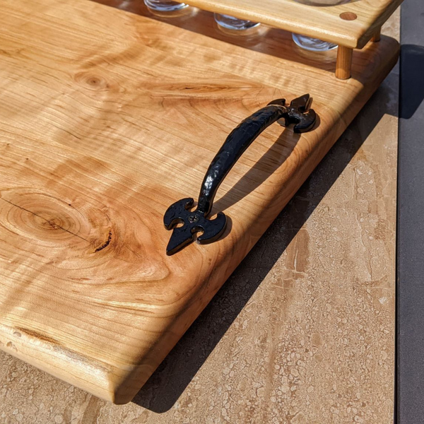 A gorgeous Cherry Wood beer flight charcuterie board with cast iron handles and clear rubber grip feet. This unique wooden beer flight board includes 6 Luminarc Barlow 5.5 oz. taster glasses and 6 - 4 oz. commercial grade stainless steel dipping sauce cups that fit this board perfectly! This board is finished in a food grade bees wax and oil mixture to give it a beautiful sheen!
