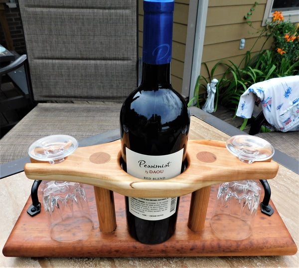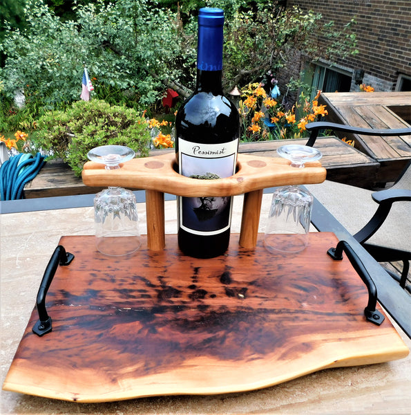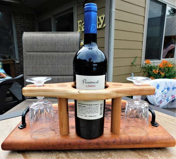 A gorgeous Cherry Wood wine glass charcuterie board with cast iron handles and clear rubber grip feet. This unique wine glass board includes 2 wine glasses and is finished in a food grade bees wax and oil mixture to give it a beautiful sheen!