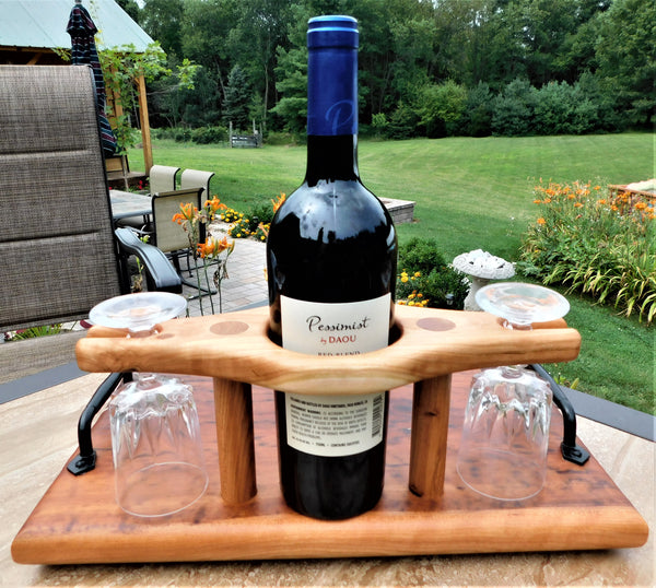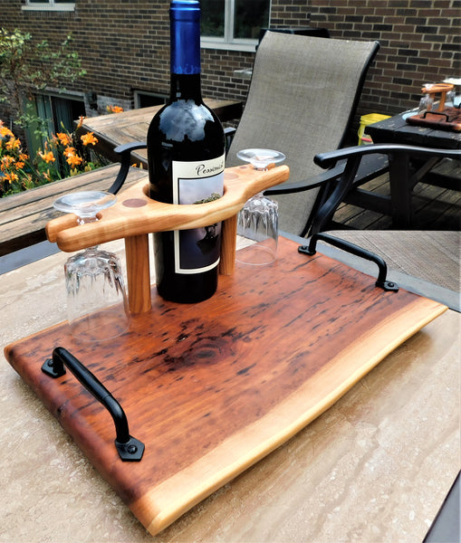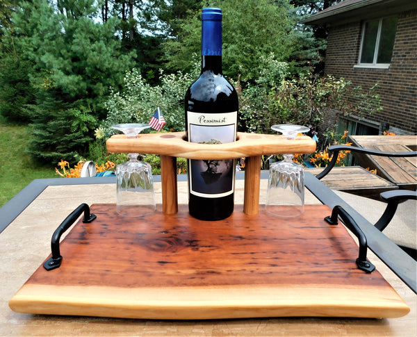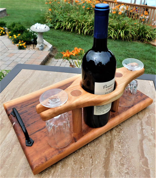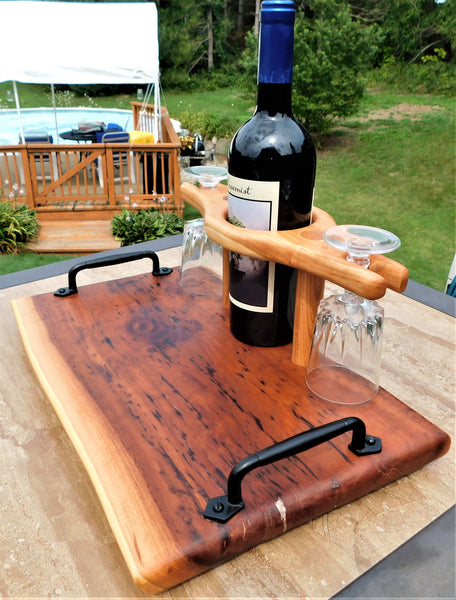 A gorgeous Cherry Wood wine glass charcuterie board with cast iron handles and clear rubber grip feet. This unique wine glass board includes 2 wine glasses and is finished in a food grade bees wax and oil mixture to give it a beautiful sheen!