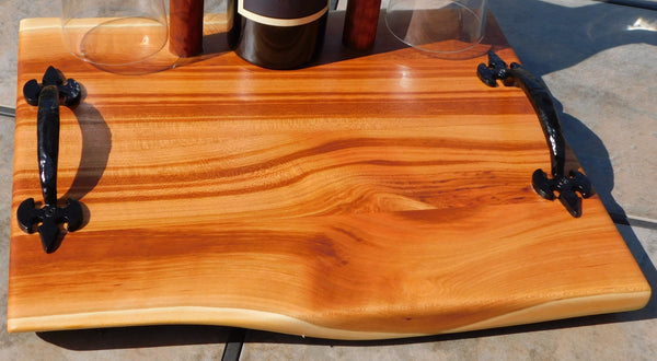 A very unique Cherry Wood wine glass charcuterie board with cast iron handles and clear rubber grip feet. This unique wine glass board includes 2 wine glasses and is finished in a food grade bees wax and oil mixture to give it a beautiful sheen!