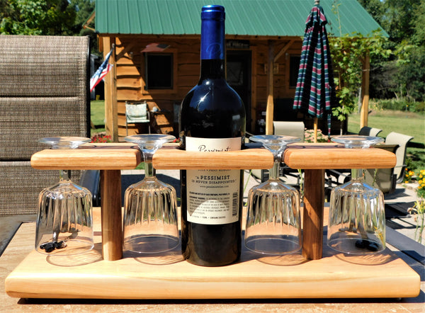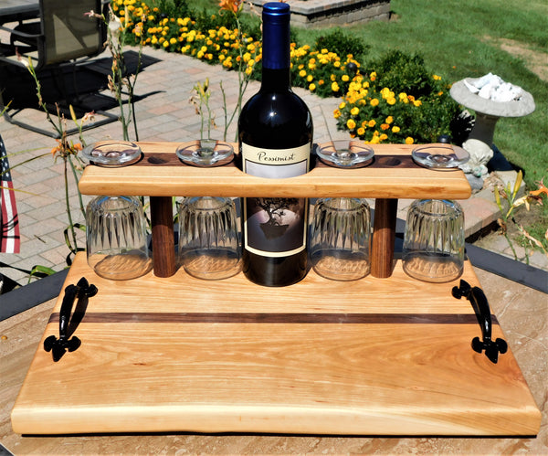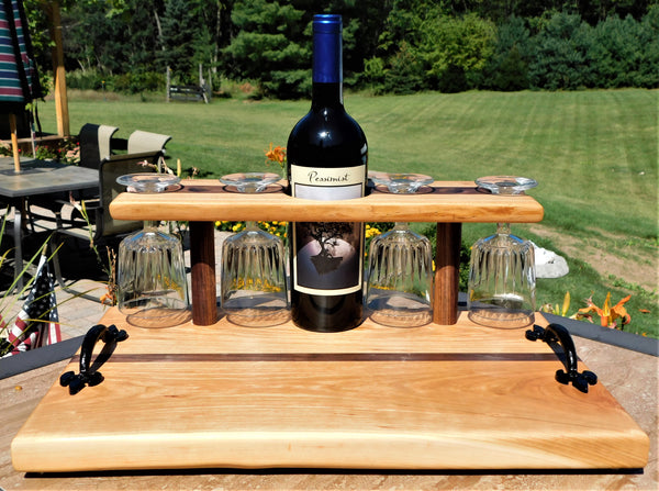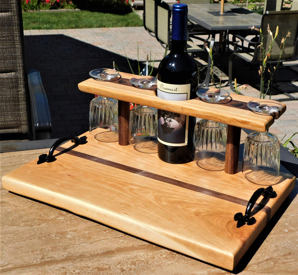 A beautiful Cherry Wood & Black Walnut wine glass charcuterie board with cast iron handles and clear rubber grip feet. This unique wine glass board includes 4 wine glasses and is finished in a food grade bees wax and oil mixture to give it a beautiful sheen!