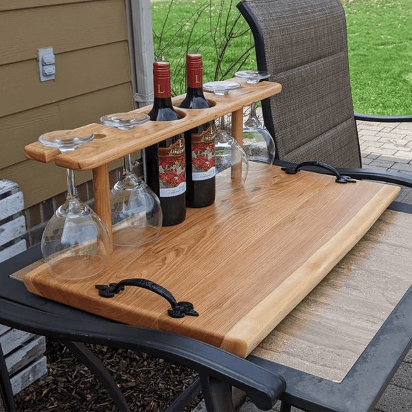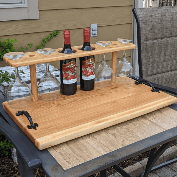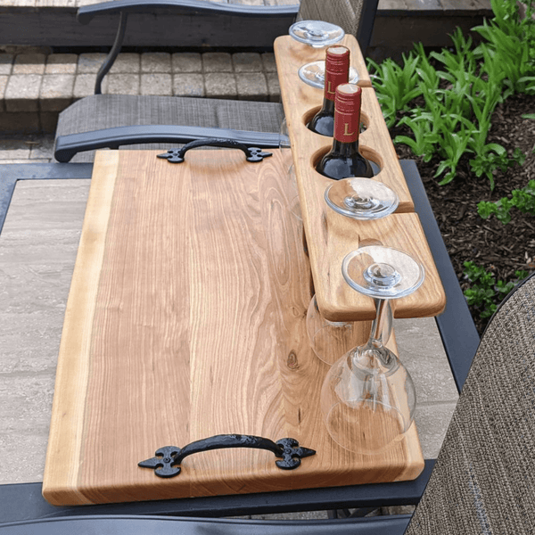 A gorgeous double-bottle Cherry Wood wine glass charcuterie board with cast iron handles and clear rubber grip feet. This unique wine glass board includes 4 wine glasses and is finished in a food grade bees wax and oil mixture to give it a beautiful sheen!