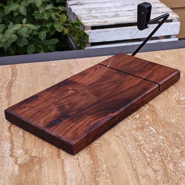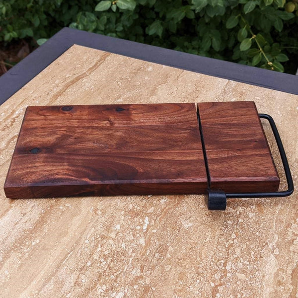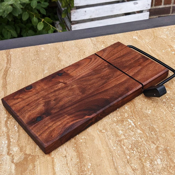 A beautifully handcrafted Black Walnut butcher block cheese slicing board finished in a food grade oil and beeswax mixture to give it a beautiful sheen.