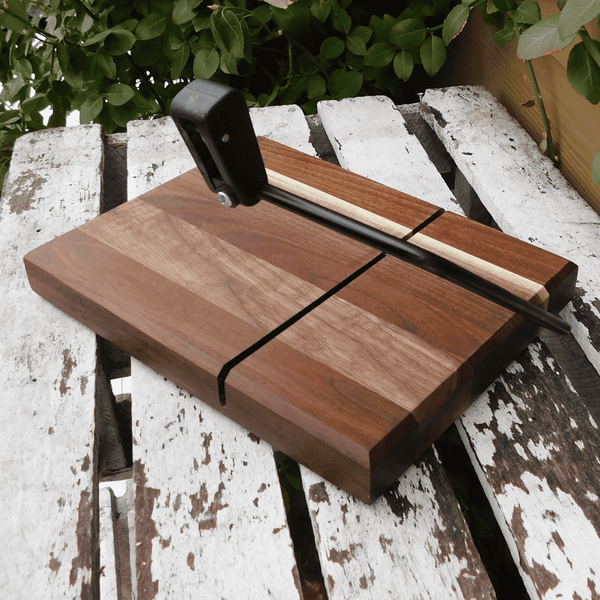 A uniquely handcrafted butcher block Black Walnut cheese slicing board, finished in a food grade oil and beeswax mixture to give it a beautiful sheen.