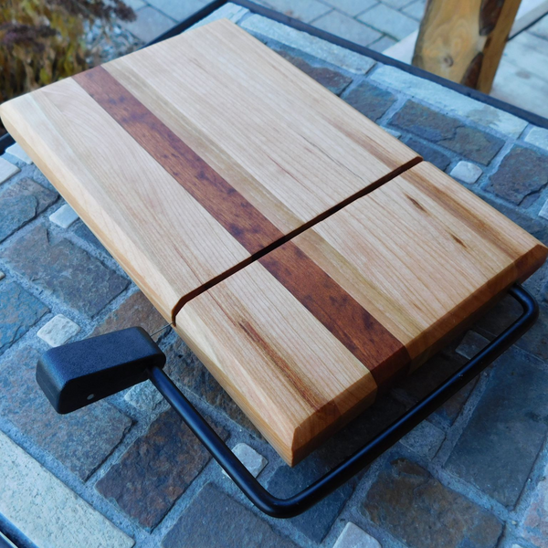A beautifully handcrafted Cherry Wood cheese slicing board with clear rubber grip feet, finished in a food grade oil and beeswax mixture to give it a beautiful sheen.