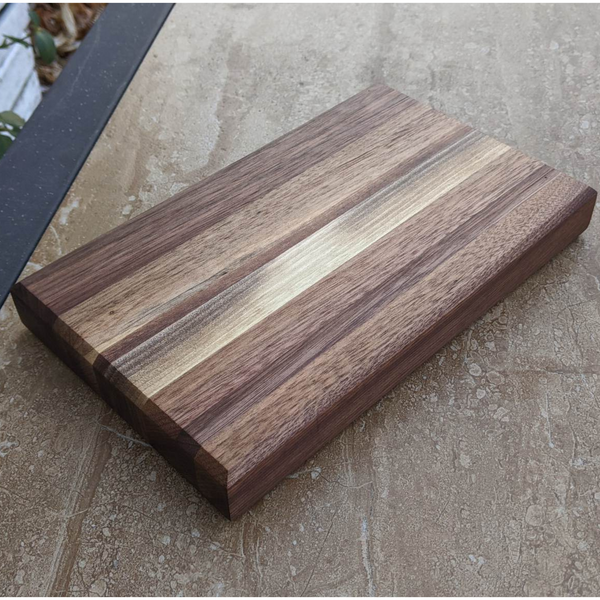 A beautiful Black Walnut edge grain cutting board with a chamfered edge, finished in a food grade oil & beeswax mixture to give it a beautiful sheen.