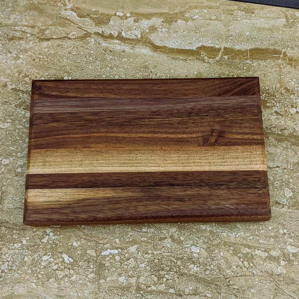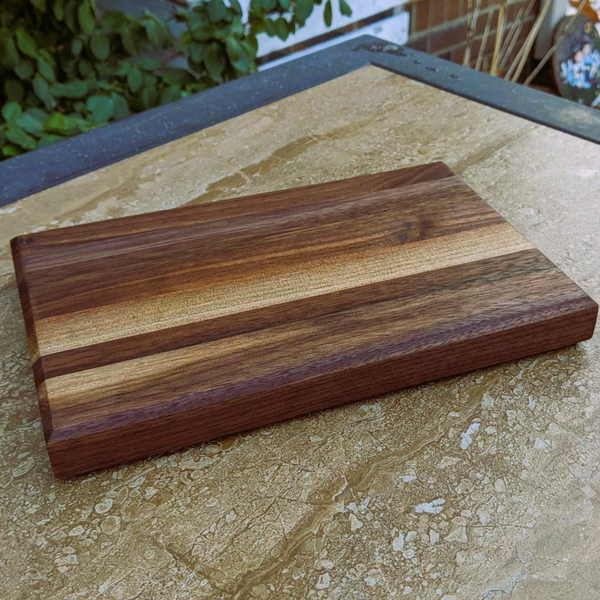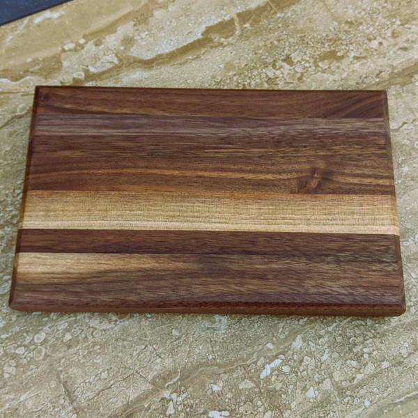 A beautiful small Black Walnut edge grain cutting board with a chamfered edge, finished in a food grade oil & beeswax mixture to give it a beautiful sheen.