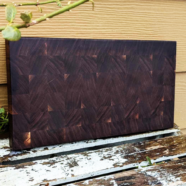 A luxurious Black Walnut wood end grain cutting board, finished in a food grade oil & beeswax mixture to give it a beautiful sheen. End grain wooden cutting boards are preferred among passionate home cooks because they are easier on blade edges and resist knife marking.
