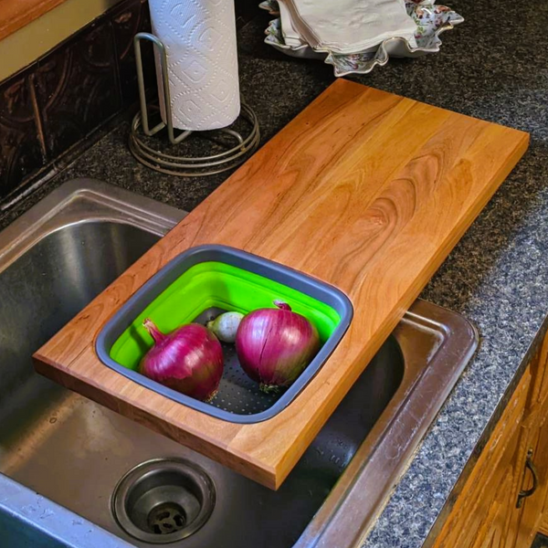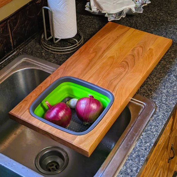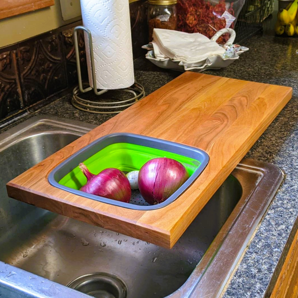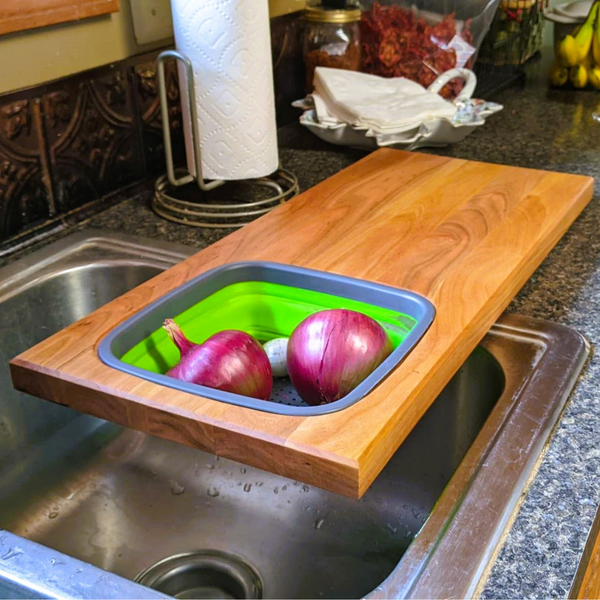 This Cherry Wood Edge Grain Cutting Board is specially designed to save time, reduce mess and maximize convenience. It features a removable colander for washing and straining, plus clear rubber grip feet for countertop stability. Perfect for everyday use or over the sink or a waste basket, it offers a multi-functional, one-of-a-kind solution.