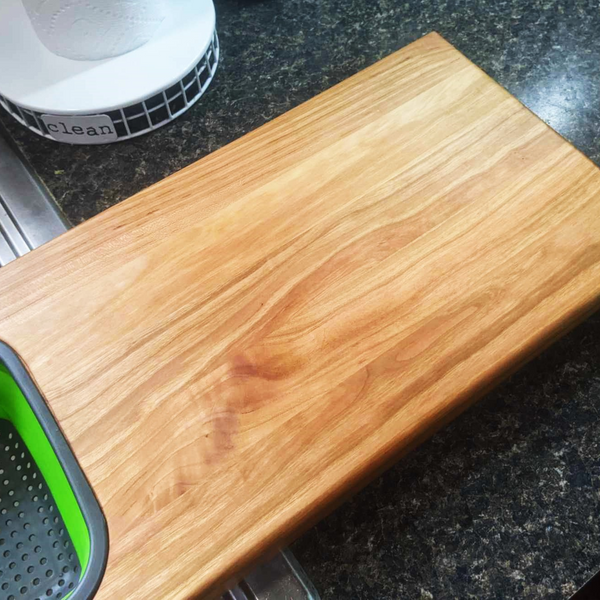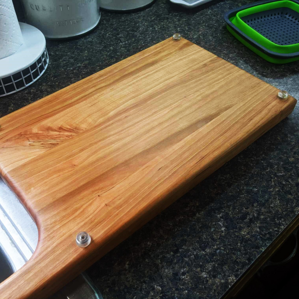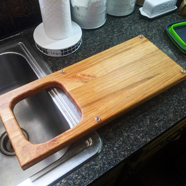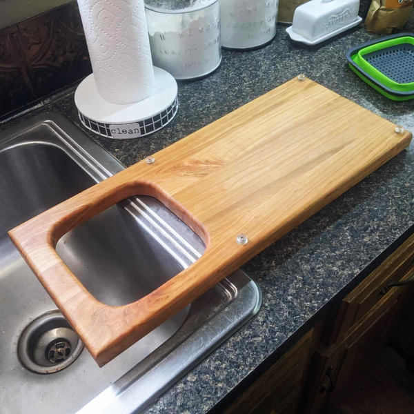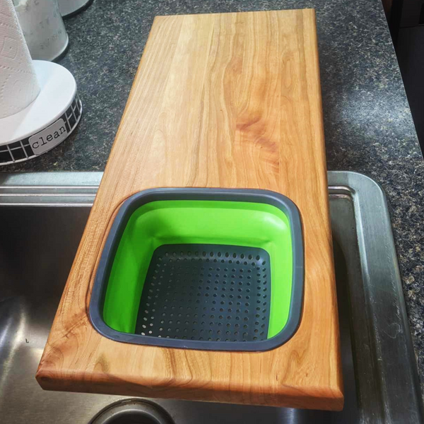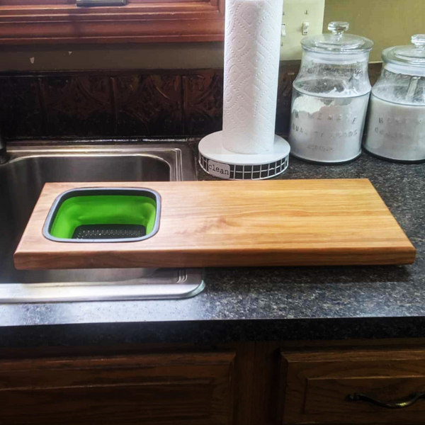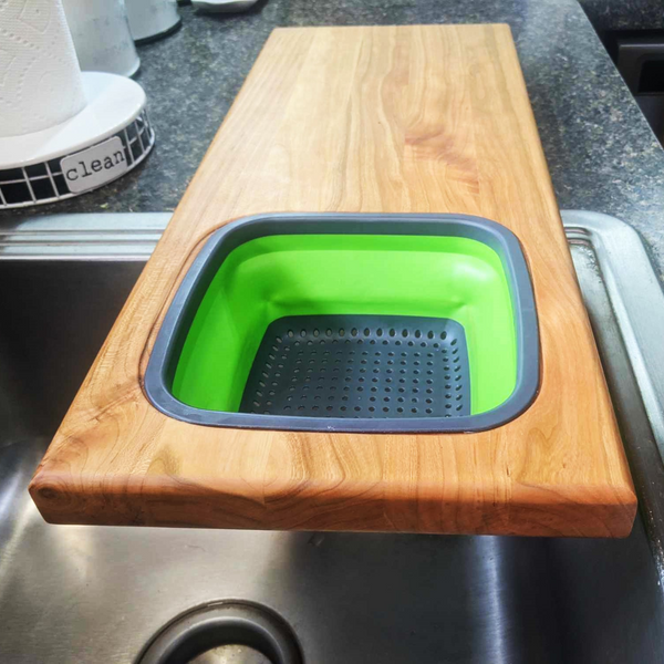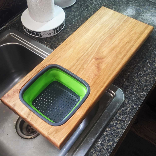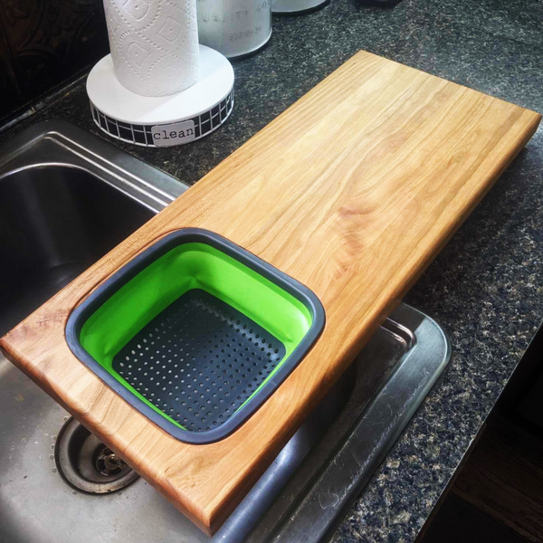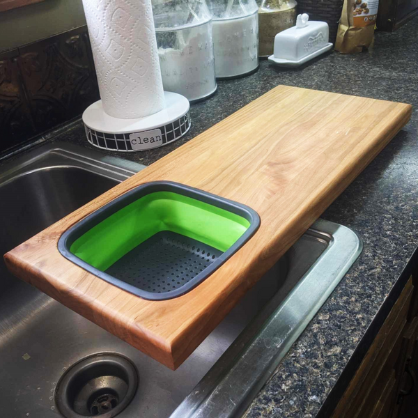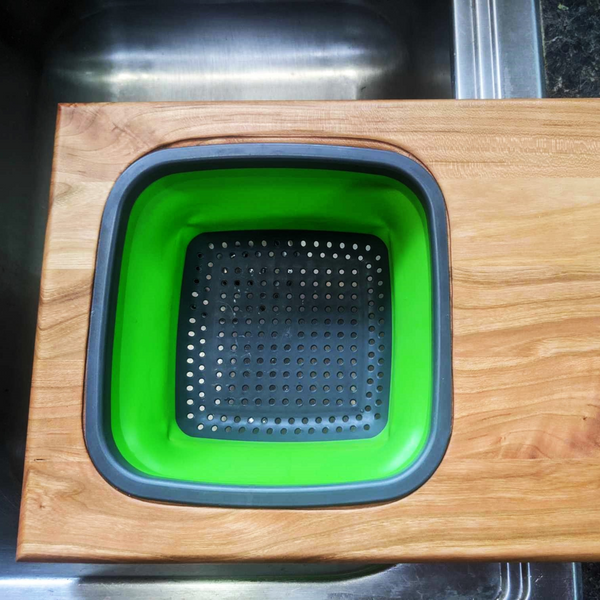 A time-saving, tidy, and multi-purpose one-of-a-kind Cherry Wood edge grain cutting board that includes a removable colander (green, as shown in photos) that can be used as a strainer or storage basket. Perfect for using over a sink while washing and chopping fruits, vegetables, and more - or on a counter top to save space and prevent mess. This cutting board can be placed at the edge of a counter top, and with colander removed, placed over a waste basket to collect extra scraps you don't need!