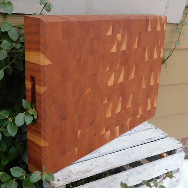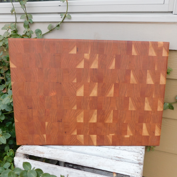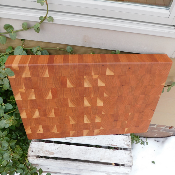 Cherry Wood end grain butcher block finished in a food grade oil & beeswax mixture to give it a beautiful sheen. End grain butcher blocks are preferred among passionate home cooks because they are easier on blade edges and resist knife marking. This attractive butcher block is finished on both sides, making it the perfect chopping block to use on either side. Includes hand grooves on the sides for easy lifting.
