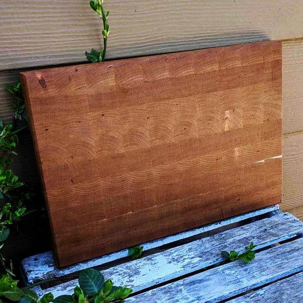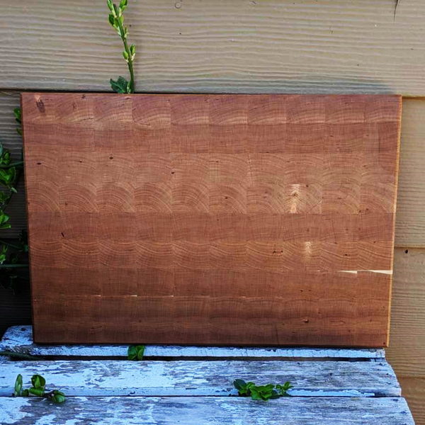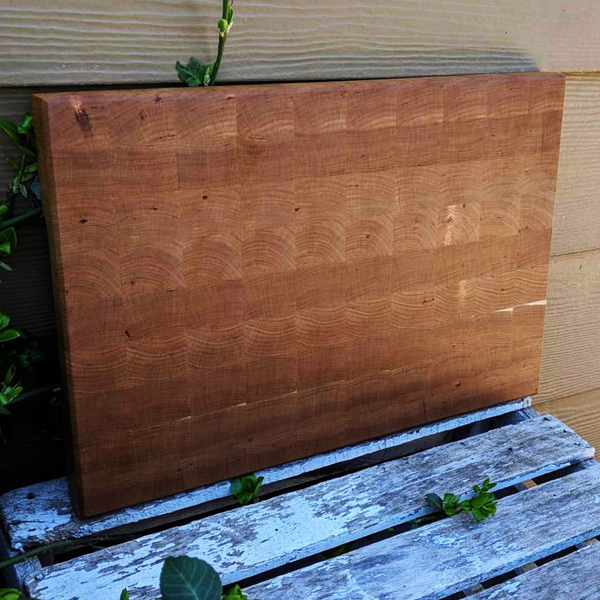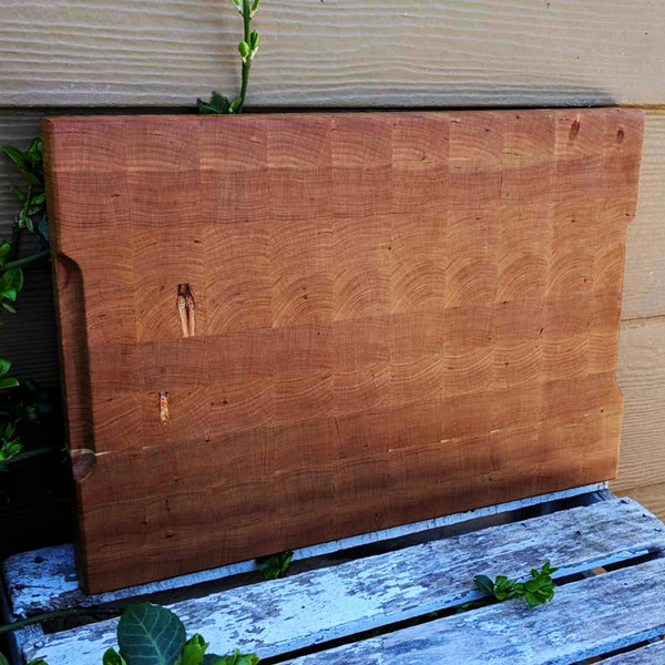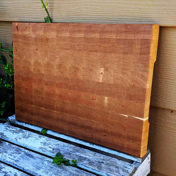A unique Cherry Wood end grain cutting board finished in a food grade oil & beeswax mixture to give it a beautiful sheen. This beautiful board includes hand grooves on both sides for easy handling and a beveled edge. End grain cutting boards are preferred among passionate home cooks because they are easier on blade edges and resist knife marking. This attractive cutting board is finished on both sides, making it the perfect cutting board to use on either side. Includes hand grooves on the sides for easy lifting.