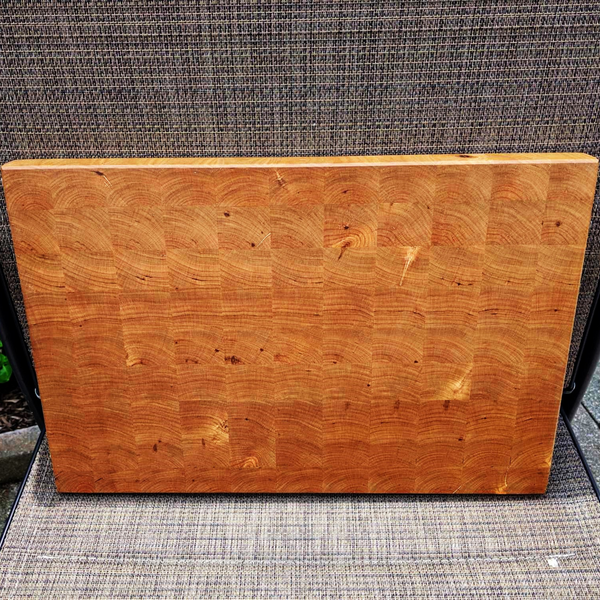 A unique Cherry Wood end grain cutting board finished in a food grade oil & beeswax mixture to give it a beautiful sheen. This beautiful board includes hand grooves on both sides for easy handling and a beveled edge. End grain cutting boards are preferred among passionate home cooks because they are easier on blade edges and resist knife marking. This attractive cutting board is finished on both sides, making it the perfect cutting board to use on either side. Includes hand grooves on the sides for easy lifting.