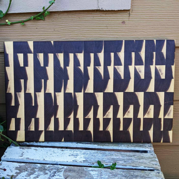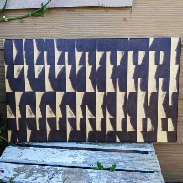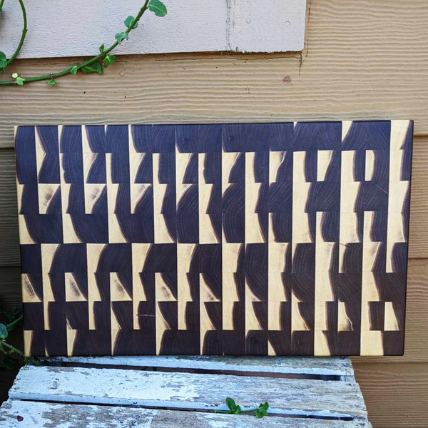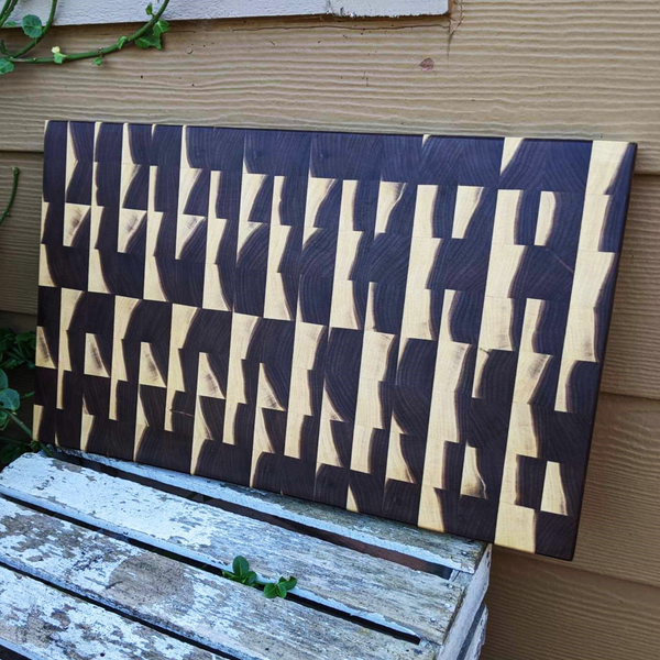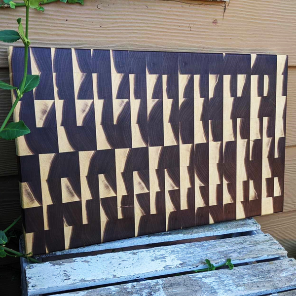 The ultimate cutting board for a home cook's perfect prep experience - a large black walnut end grain board with a beveled edge! End grain boards are a must-have for the passionate chef, offering unmatched protection against blade markings and preserving the sharpness of your knives.