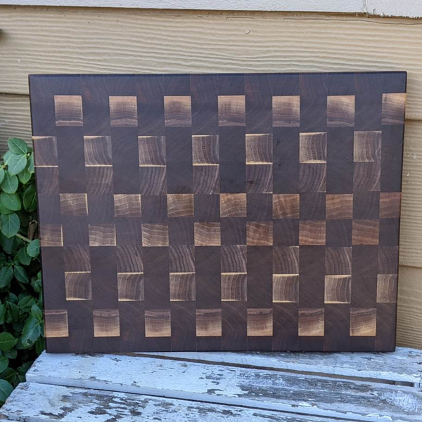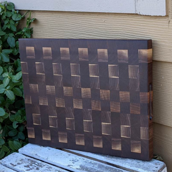 A large Black Walnut end grain cutting board with built-in handles and clear rubber grip feet, finished in a food grade oil & beeswax mixture to give it a beautiful sheen. End grain cutting boards are preferred among passionate home cooks because they are easier on blade edges and resist knife marking.
