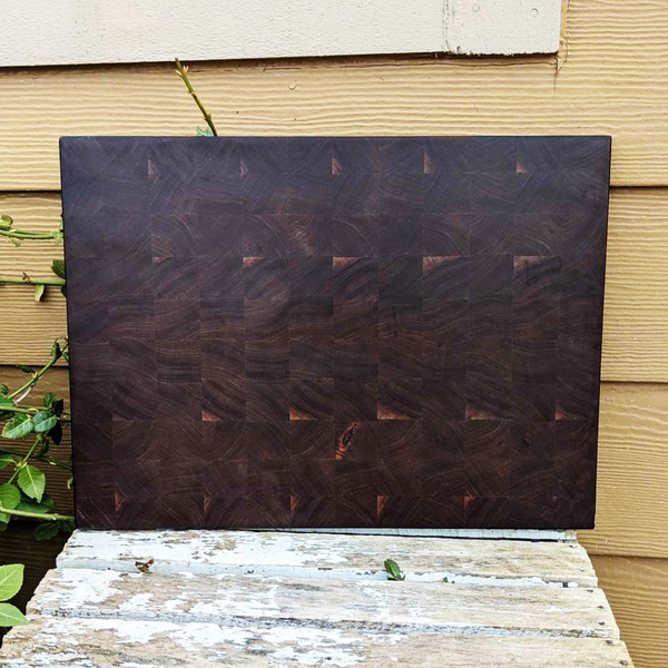 A luxurious Black Walnut wood end grain cutting board with hand grooves on the sides, finished in a food grade oil & beeswax mixture to give it a beautiful sheen. End grain wooden cutting boards are preferred among passionate home cooks because they are easier on blade edges and resist knife marking.