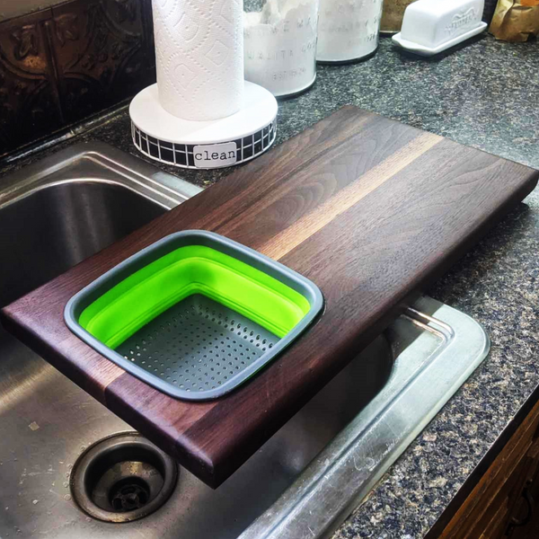 This one-of-a-kind Black Walnut edge grain cutting board gets the job done quickly and cleanly. It comes with a removable colander (green, as pictured) that doubles as a strainer and storage basket, and clear rubber grip feet for superior stability. Place it over the sink for washing and chopping, or on a counter top to save space and contain mess. With colander removed, use it for everyday tasks and over a waste basket to catch scraps.