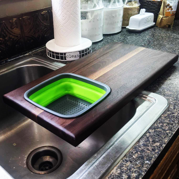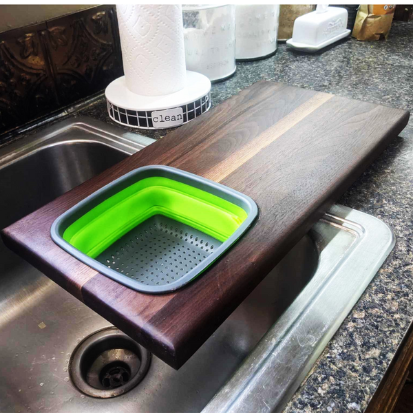 Over The Sink Black Walnut Edge Grain Cutting Board with Colander and Clear Rubber Grip Feet