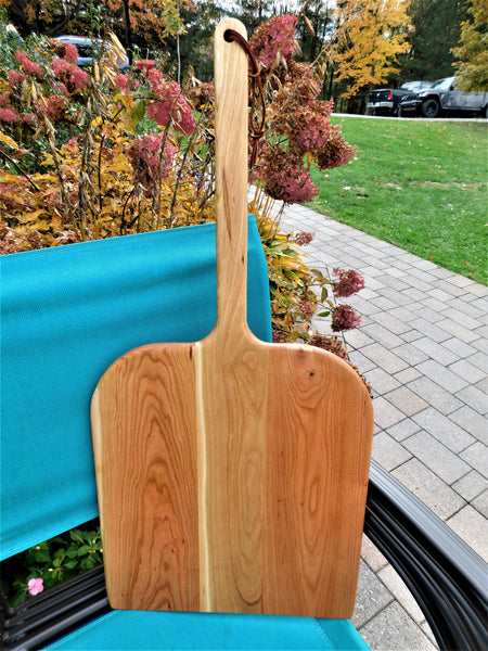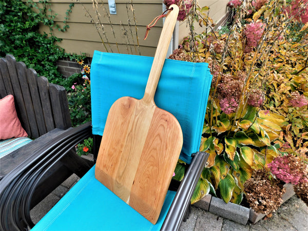 A beautifully handcrafted Cherry Wood pizza peel. Our pizza peels are finished in a food grade oil and beeswax mixture to give it a beautiful satin sheen. Includes a handy leather cord for easy storage!