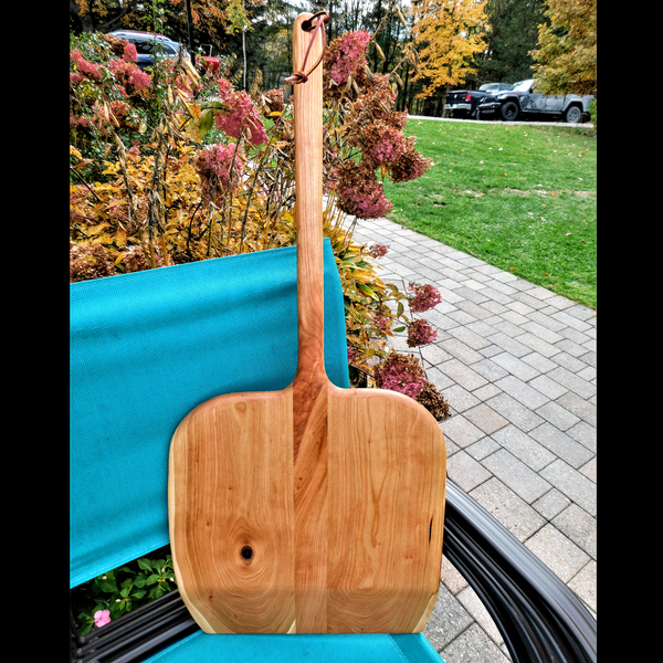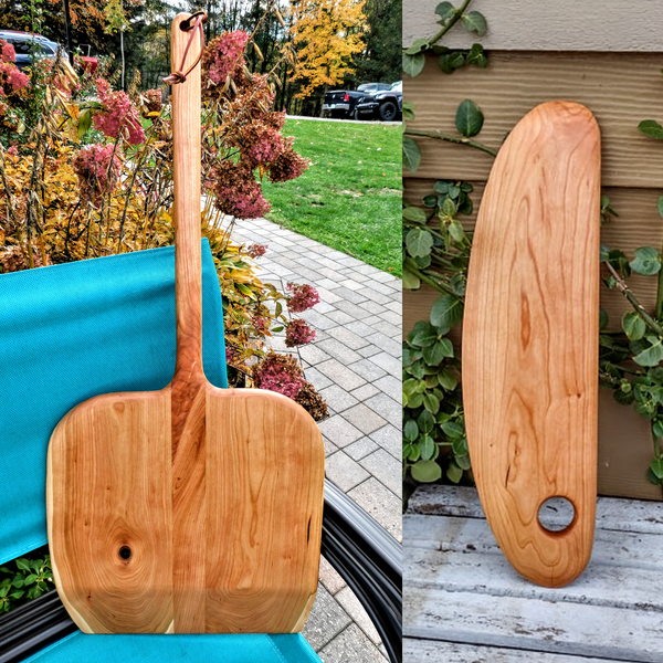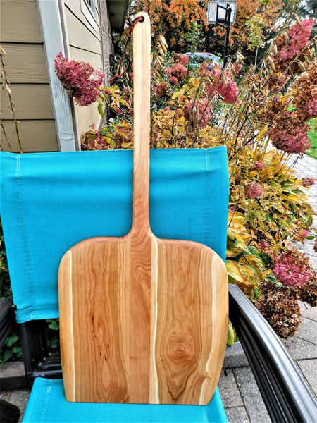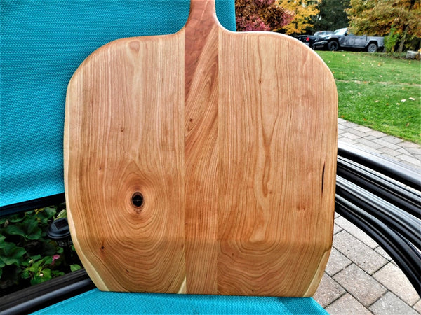 The centerpiece of every pizza party, a beautifully handcrafted Cherry Wood pizza peel and pizza cutter! Our pizza peels and cutters are finished in a food grade oil and beeswax mixture to give it a beautiful satin sheen.