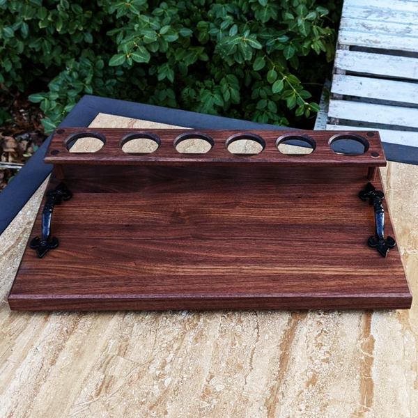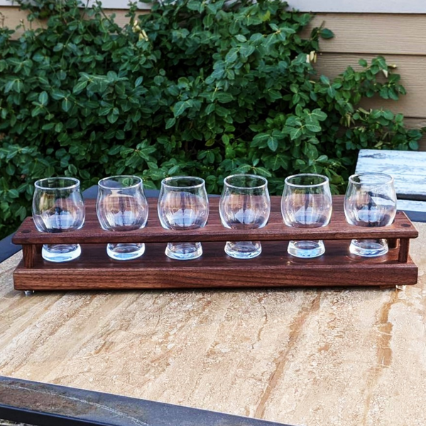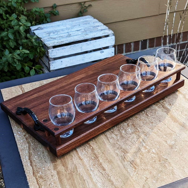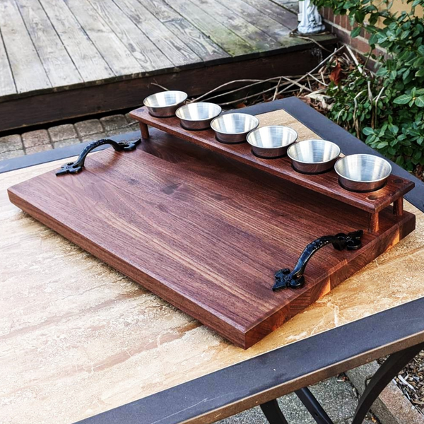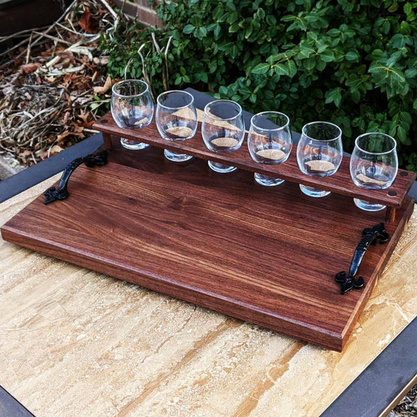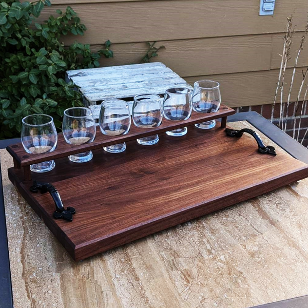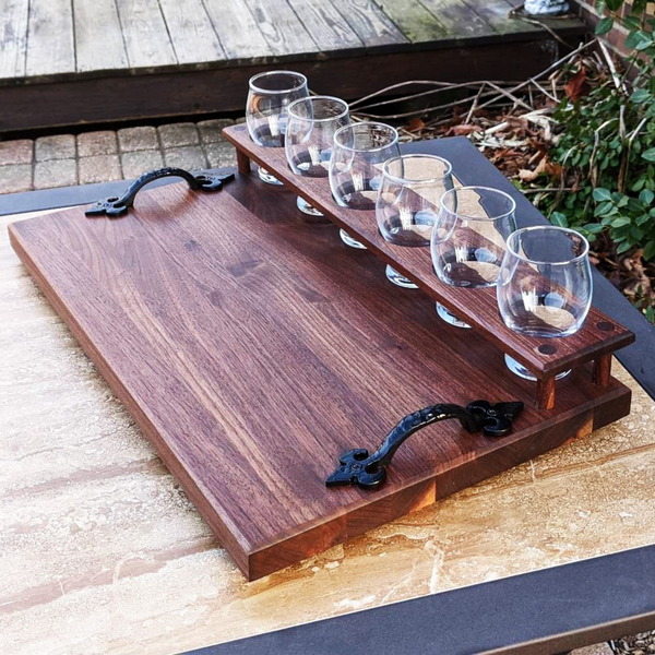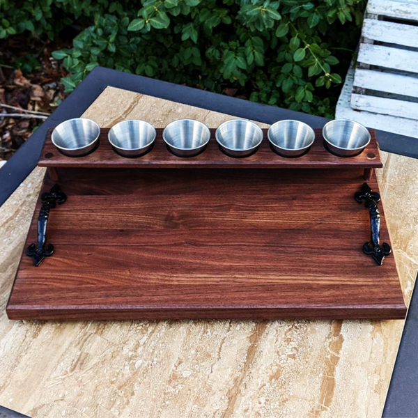 Our Black Walnut Wood Beer Flight Butcher Block/Charcuterie Board is perfect for entertaining. Featuring a food grade bees wax and oil mixture for a beautiful sheen, and heavy-duty cast iron handles for durability, this board is sure to impress. It also includes 6 Luminarc Barlow 5.5oz taster glasses and 6-4oz commercial grade stainless steel dipping sauce cups. Impress your guests with this unique and attractive board.