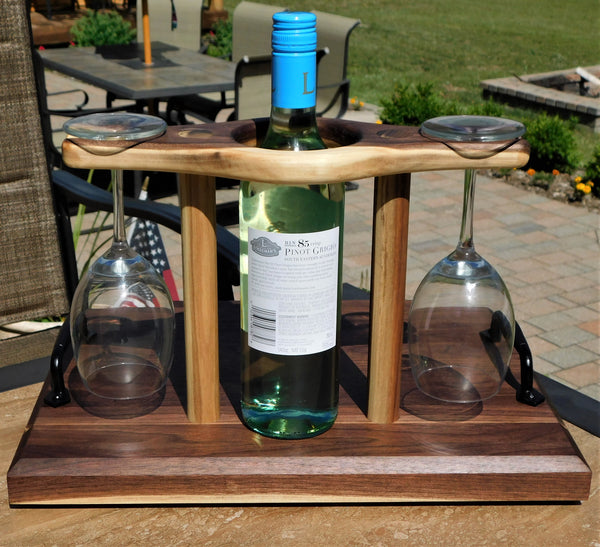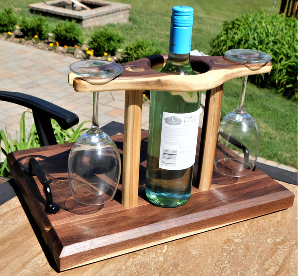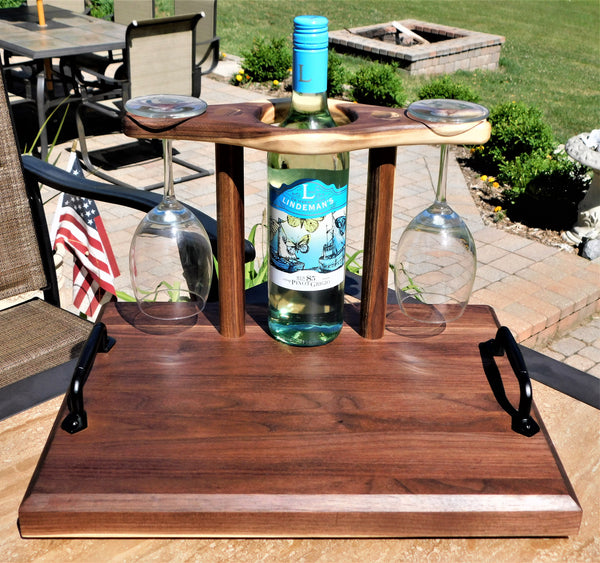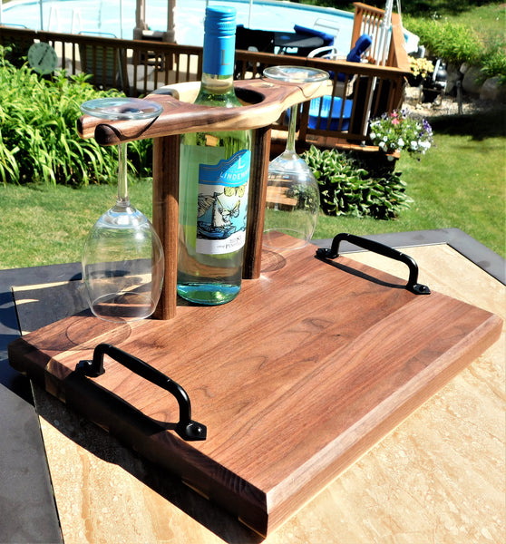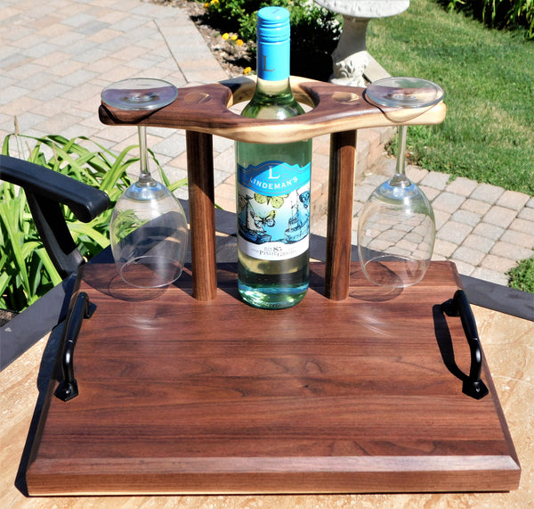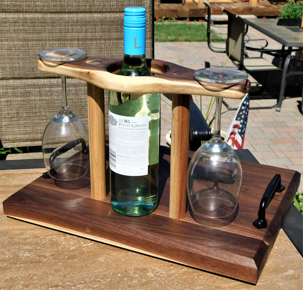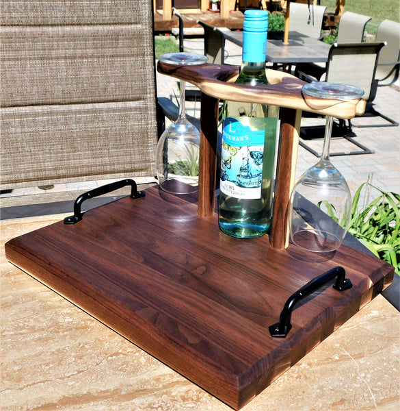 Black Walnut Wood Butcher Block Style Wine Caddy Cutting Board with Wine Glasses