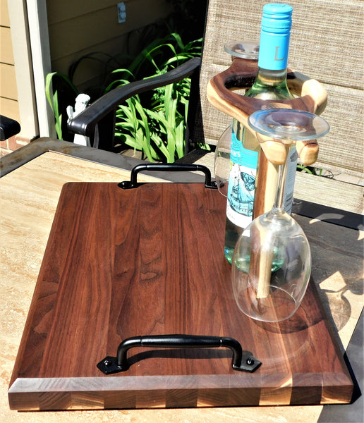A luxurious Black Walnut wood butcher board style wine caddy cutting board, with cast iron handles and clear rubber grip feet. This unique wooden wine glass board includes 2 wine glasses and is finished in a food grade bees wax and oil mixture to give it a beautiful sheen!