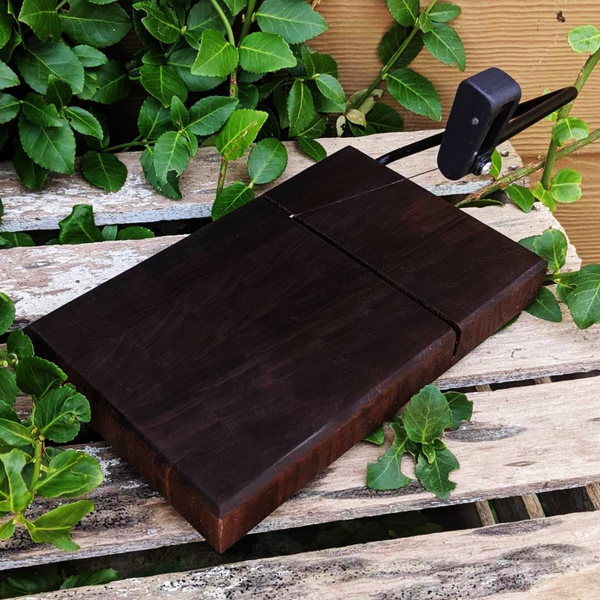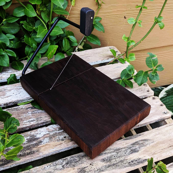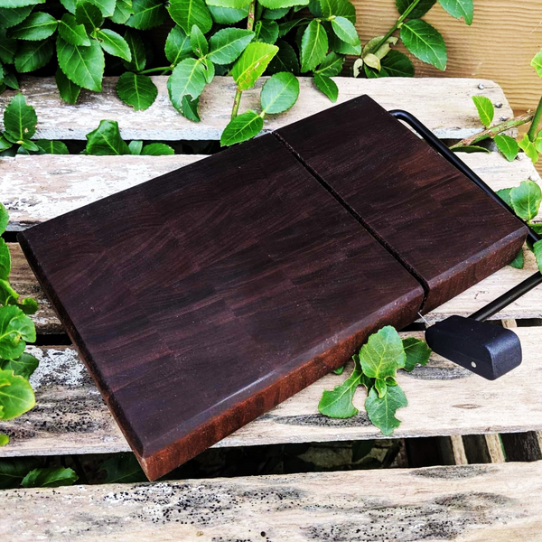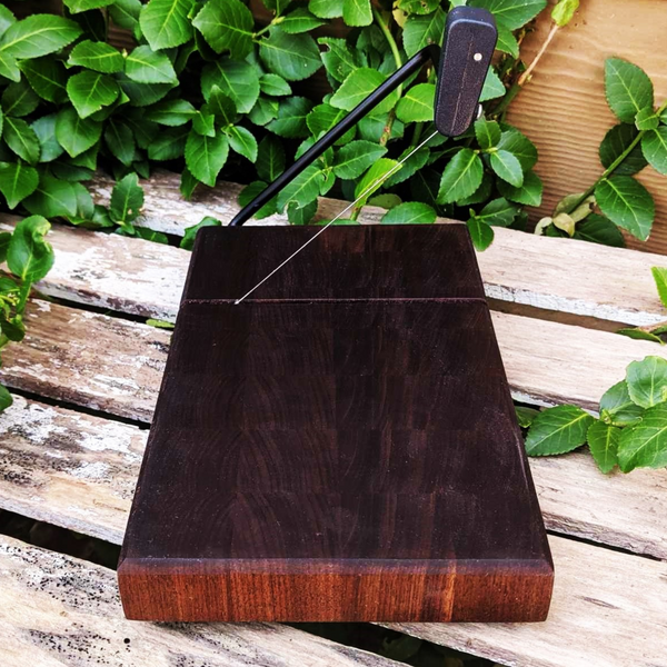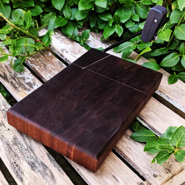 Experience the beauty and functionality of our Black Walnut end grain cheese slicing board, expertly finished with a food-safe oil and beeswax blend that enhances its stuning appearance. Our wooden cheese slicer effortlessly creates flawless cuts for a truly perfect slicing experience.