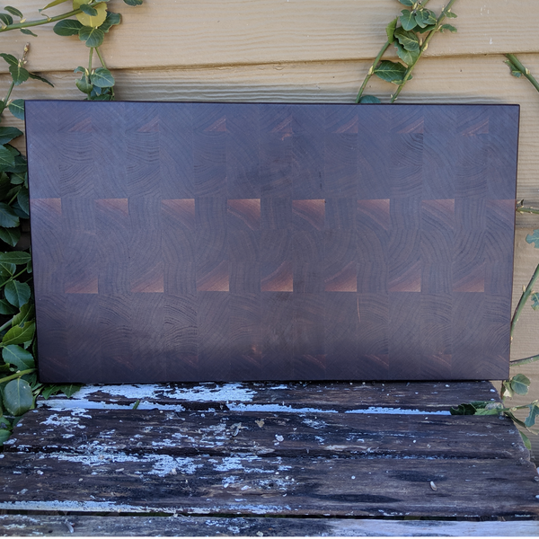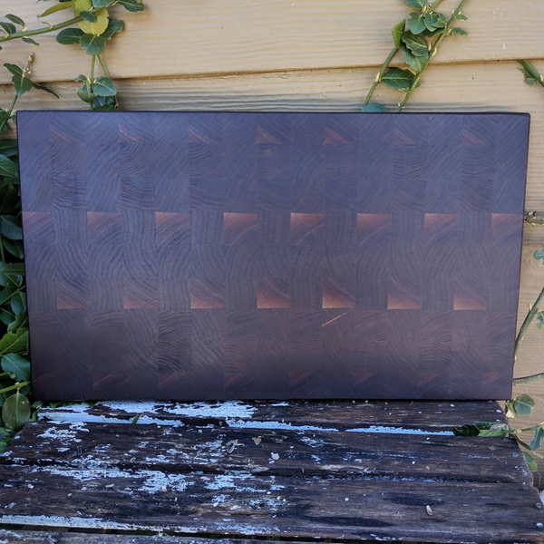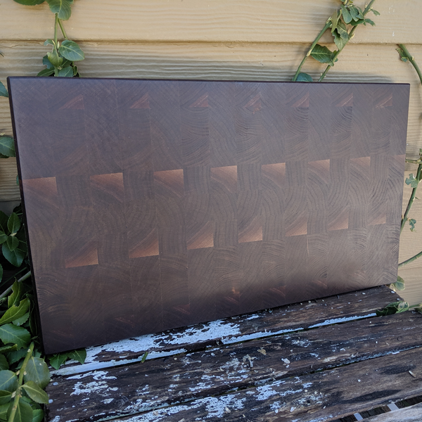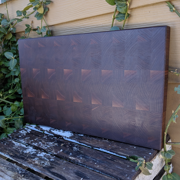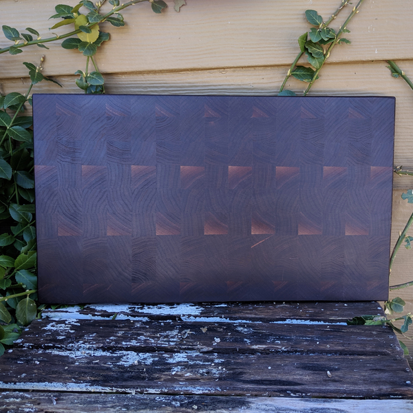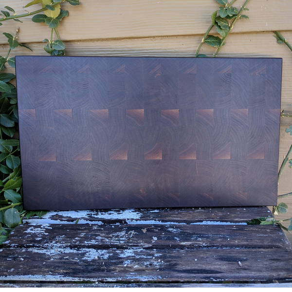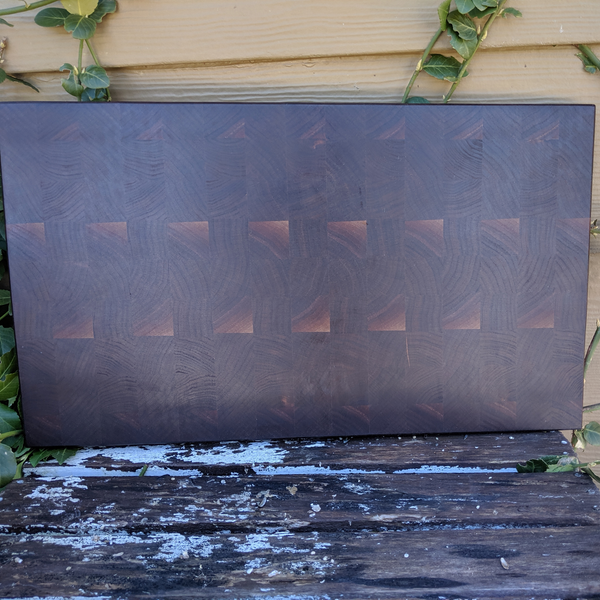 A large Black Walnut end grain cutting board with a beveled edge, finished in a food grade oil & beeswax mixture to give it a beautiful sheen. End grain cutting boards are preferred among passionate home cooks because they are easier on blade edges and resist knife marking.