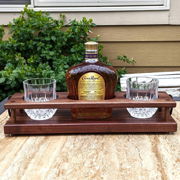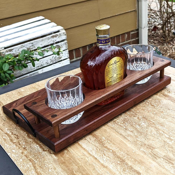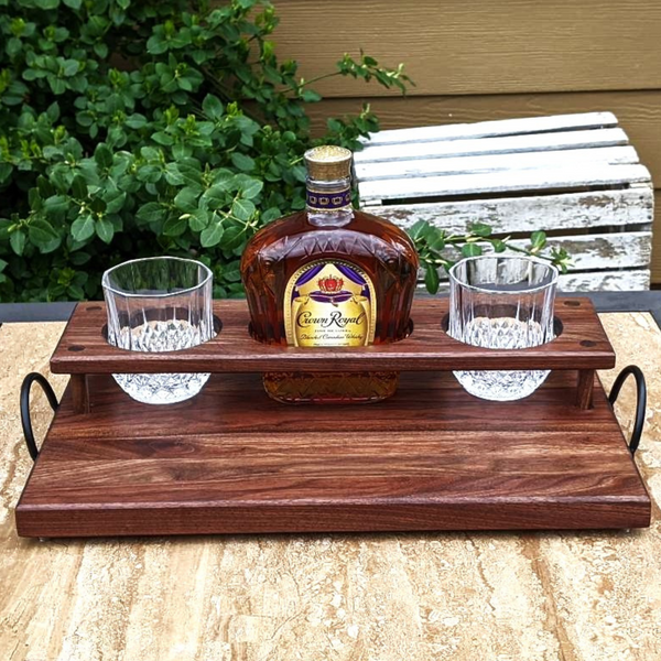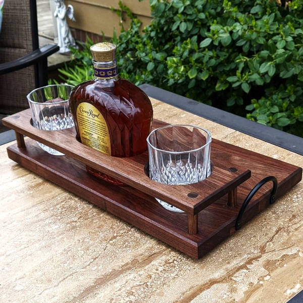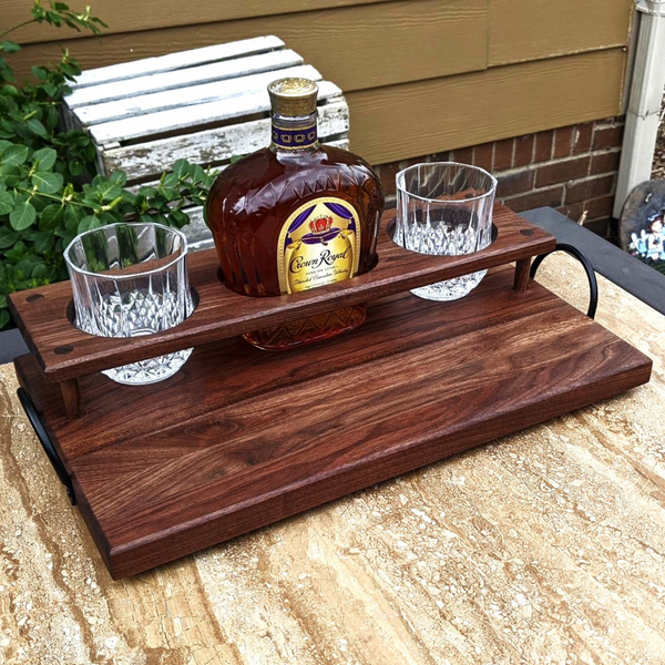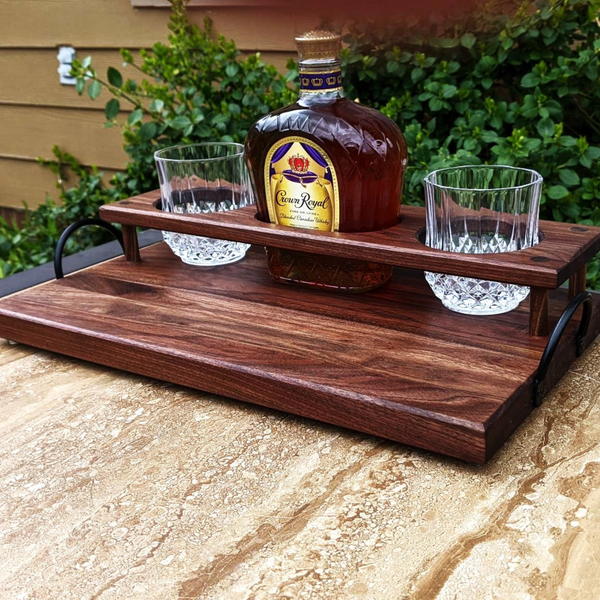 Black Walnut Wood Whiskey Charcuterie Tray with Whiskey Glasses, Cast Iron Handles, & Clear Rubber Grip Feet