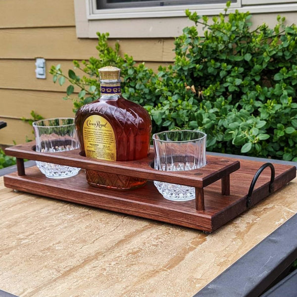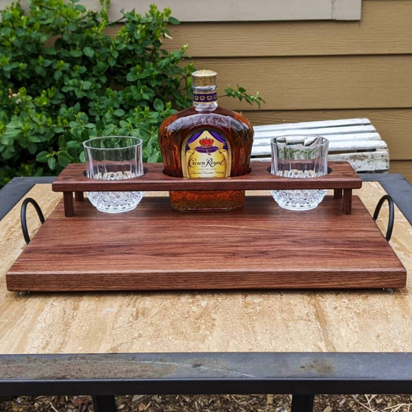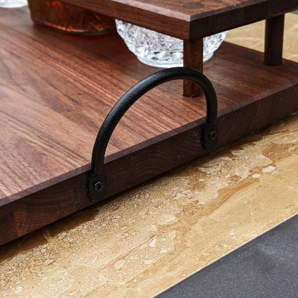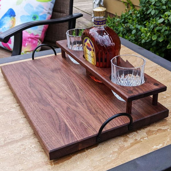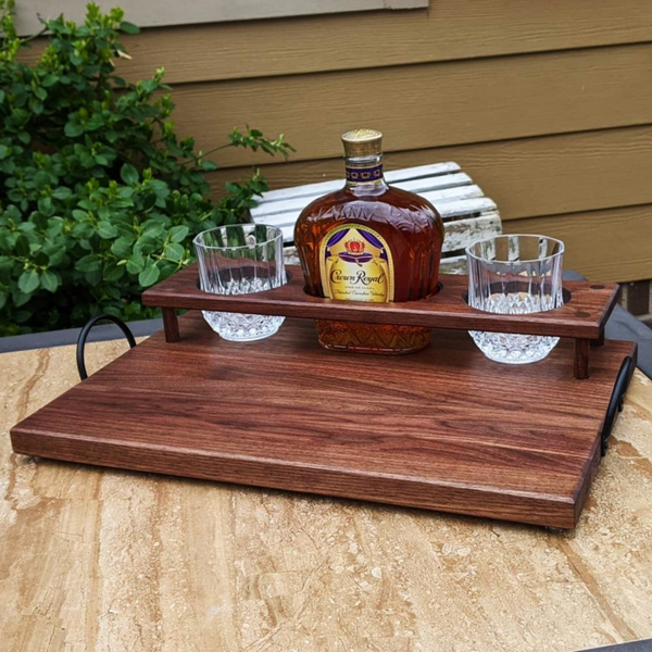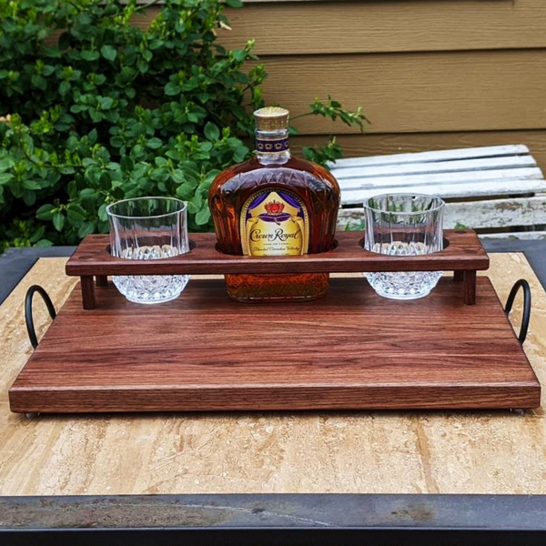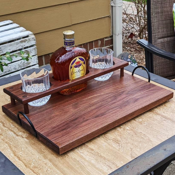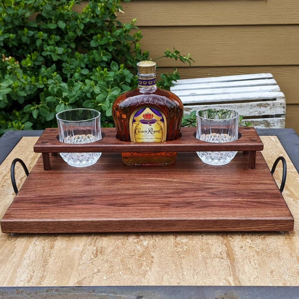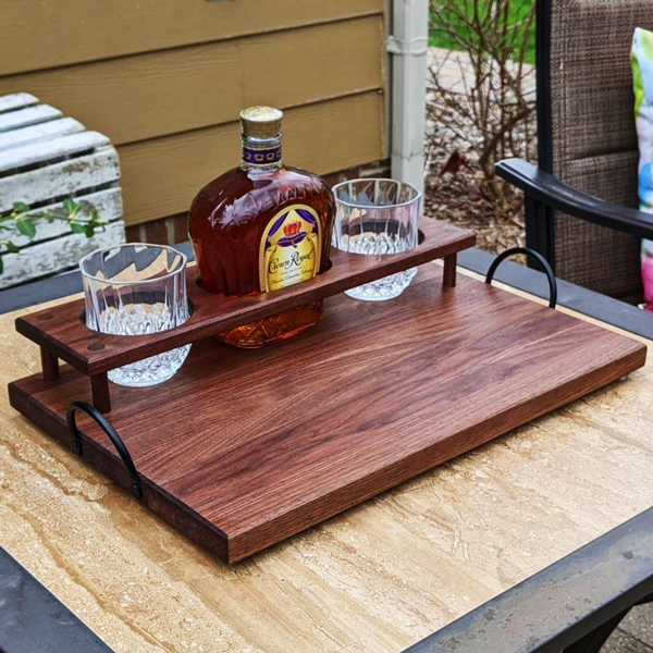 Black Walnut Wood Whiskey Charcuterie Tray with Whiskey Glasses, Cast Iron Handles, & Clear Rubber Grip Feet