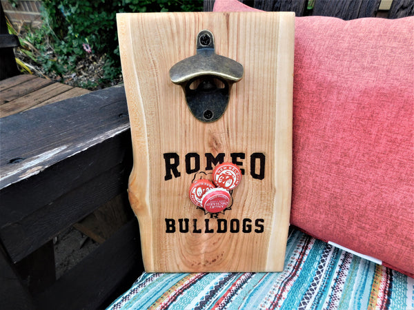 Romeo Bulldogs Engraved Cherry Wood Bottle Opener