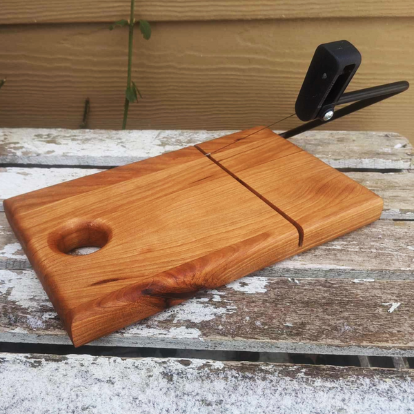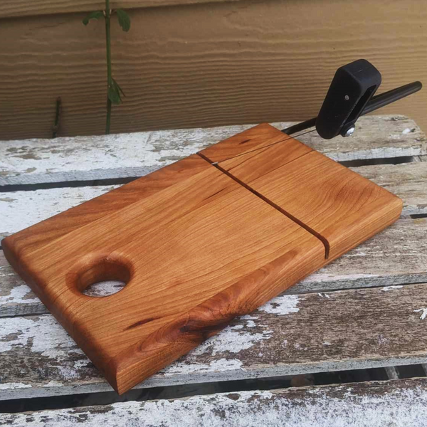 A beautifully handcrafted Cherry Wood cheese slicing board with a storage convenient handle, finished in a food grade oil and beeswax mixture to give it a beautiful sheen.