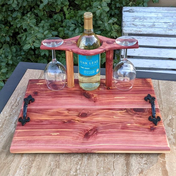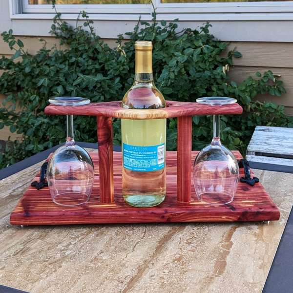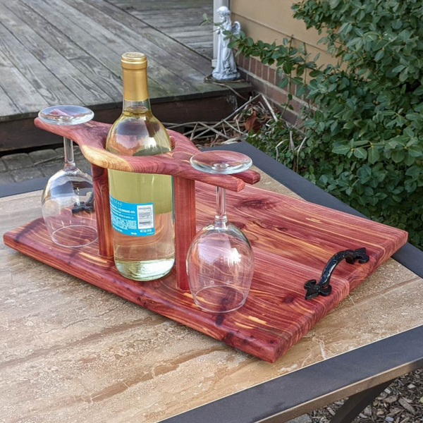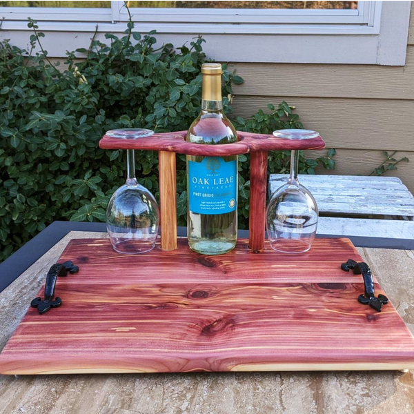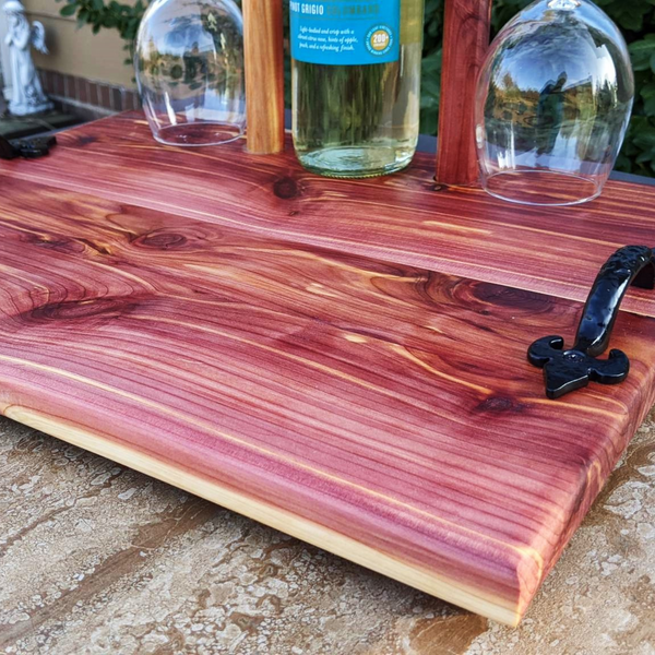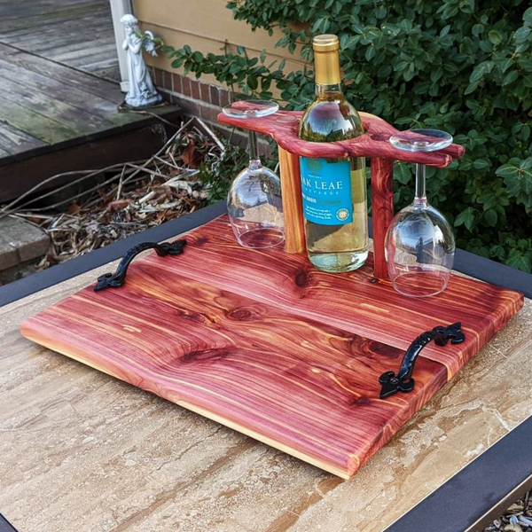 Entertain in style with this stunning Red Cedar wine charcuterie board with wine glasses. It's crafted with cast iron handles and clear rubber grip feet to provide a secure carrying experience. Finished with a food grade bees wax and oil mix, its elegant sheen will ensure it stands out! Perfect for special occasions.