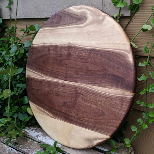 A beautifully handcrafted Black Walnut Wood pizza tray that can double as a round charcuterie serving board, or a rustic cake centerpiece! Our wooden pizza trays are finished in a food grade oil and beeswax mixture to give it a beautiful satin sheen. This ensures a safe and beautiful surface to serve up both your favorite pizza pies and delicious charcuterie boards. Enjoy pizza night with a touch of rustic elegance!