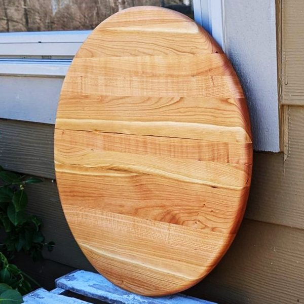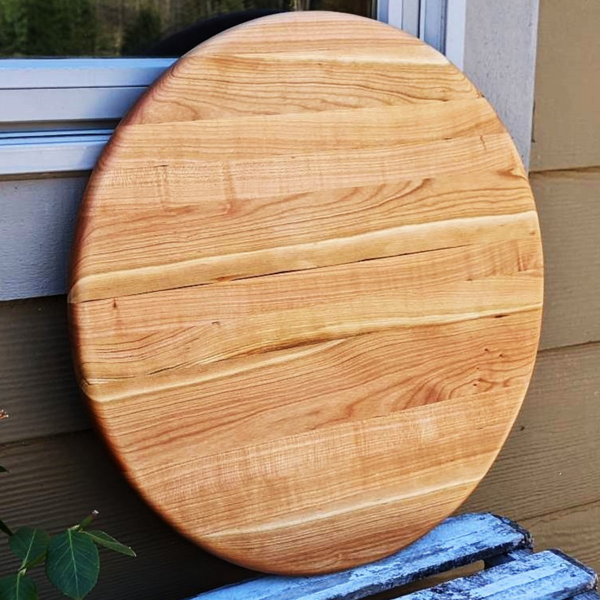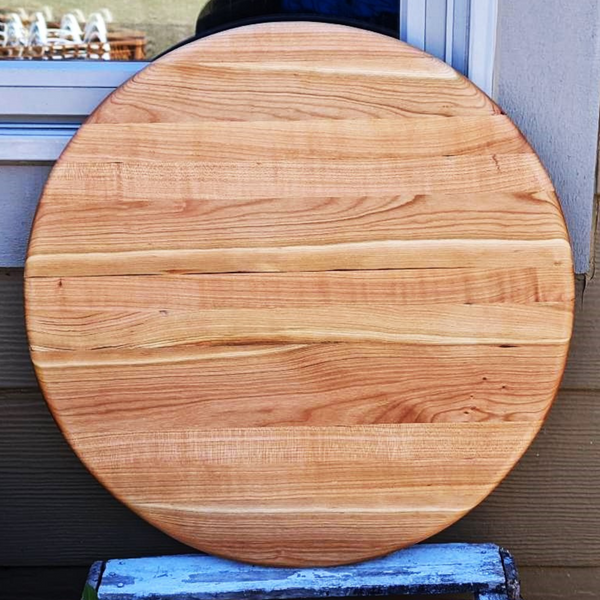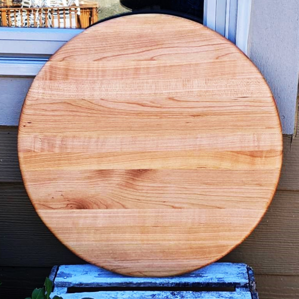 A beautifully handcrafted Cherry Wood pizza tray that can double as a round charcuterie serving board, or a rustic cake centerpiece! Our wooden pizza trays are finished in a food grade oil and beeswax mixture to give it a beautiful satin sheen. This tray is perfect for entertaining guests or as a decorative statement piece. It also features a natural and non-toxic finish, making it safe to use for serving food.