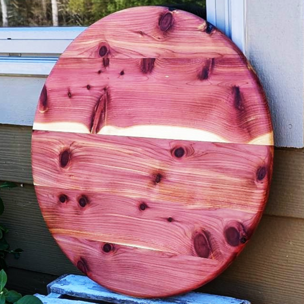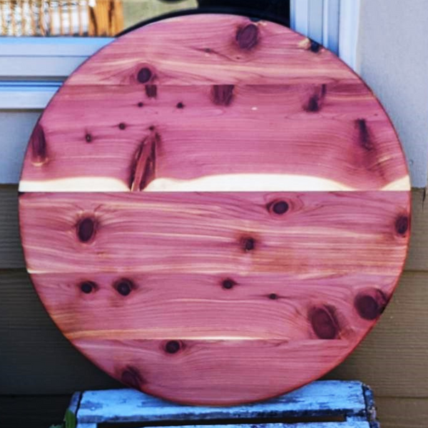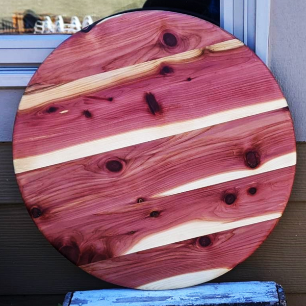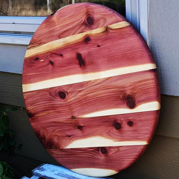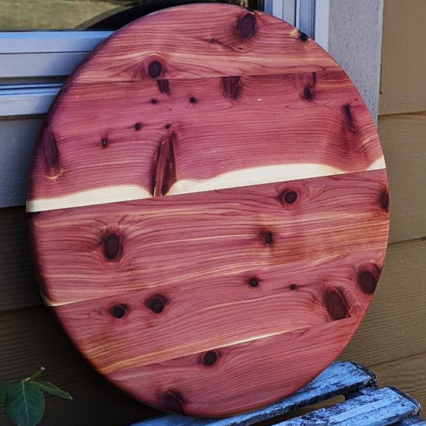 A beautifully handcrafted Red Cedar Wood pizza tray that can double as a round charcuterie serving board, or a rustic cake centerpiece! Our wooden pizza trays are finished in a food grade oil and beeswax mixture to give it a beautiful satin sheen. This ensures a safe and beautiful surface to serve up both your favorite pizza pies and delicious charcuterie boards. Enjoy every meal with a touch of rustic elegance!