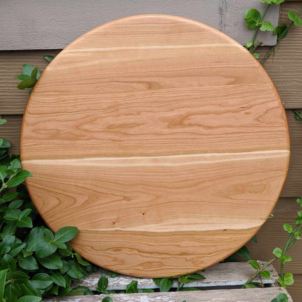 A beautifully handcrafted round wooden Cherry Wood pizza tray. Our pizza trays are finished in a food grade oil and beeswax mixture to give it a beautiful satin sheen.