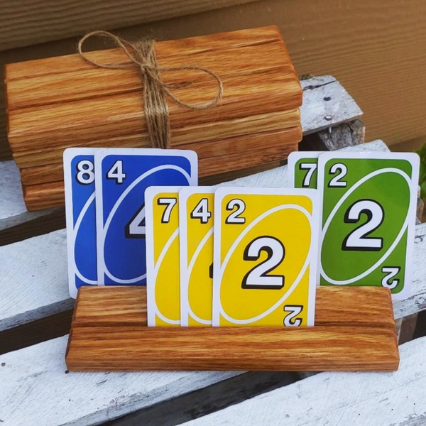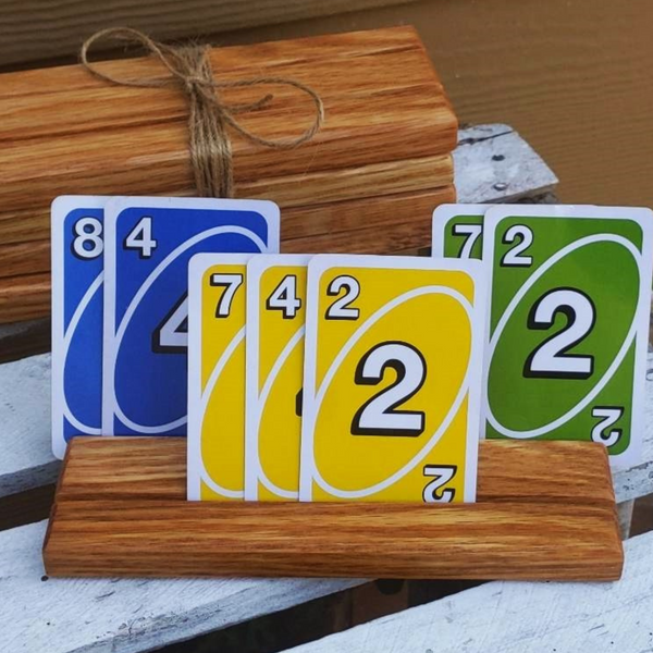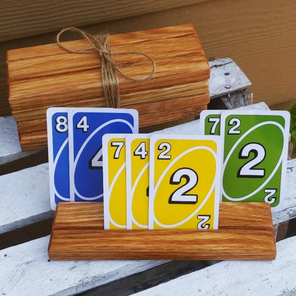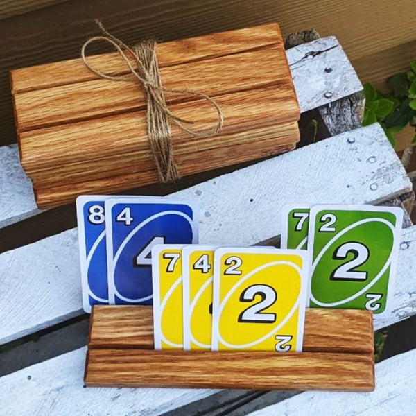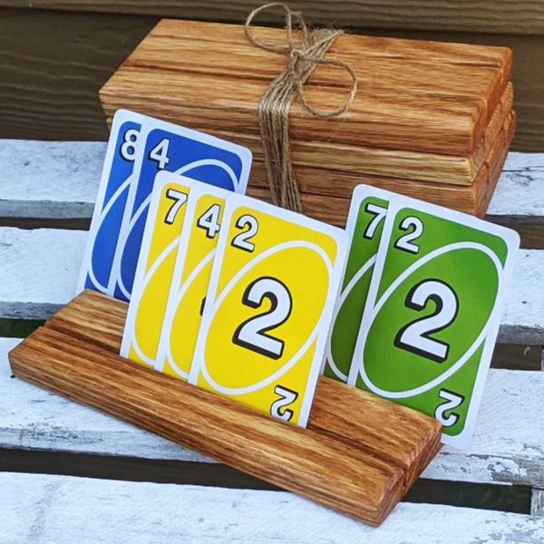 A set of two oak hardwood playing card holders featuring two angled card slots, designed to improve visibility and make playing cards easier to manage. Perfect for all ages, the holders securely store many cards and guarantee a fun, convenient experience.