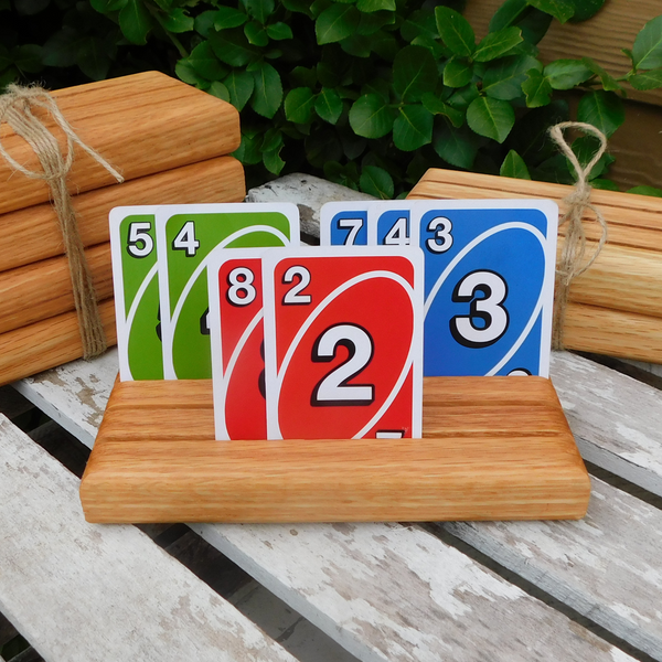 Our Oak Hardwood playing card holders are great for all ages and hold many cards! You will receive a set of TWO playing card holders, each holder has three angled card slots for increased visibility.